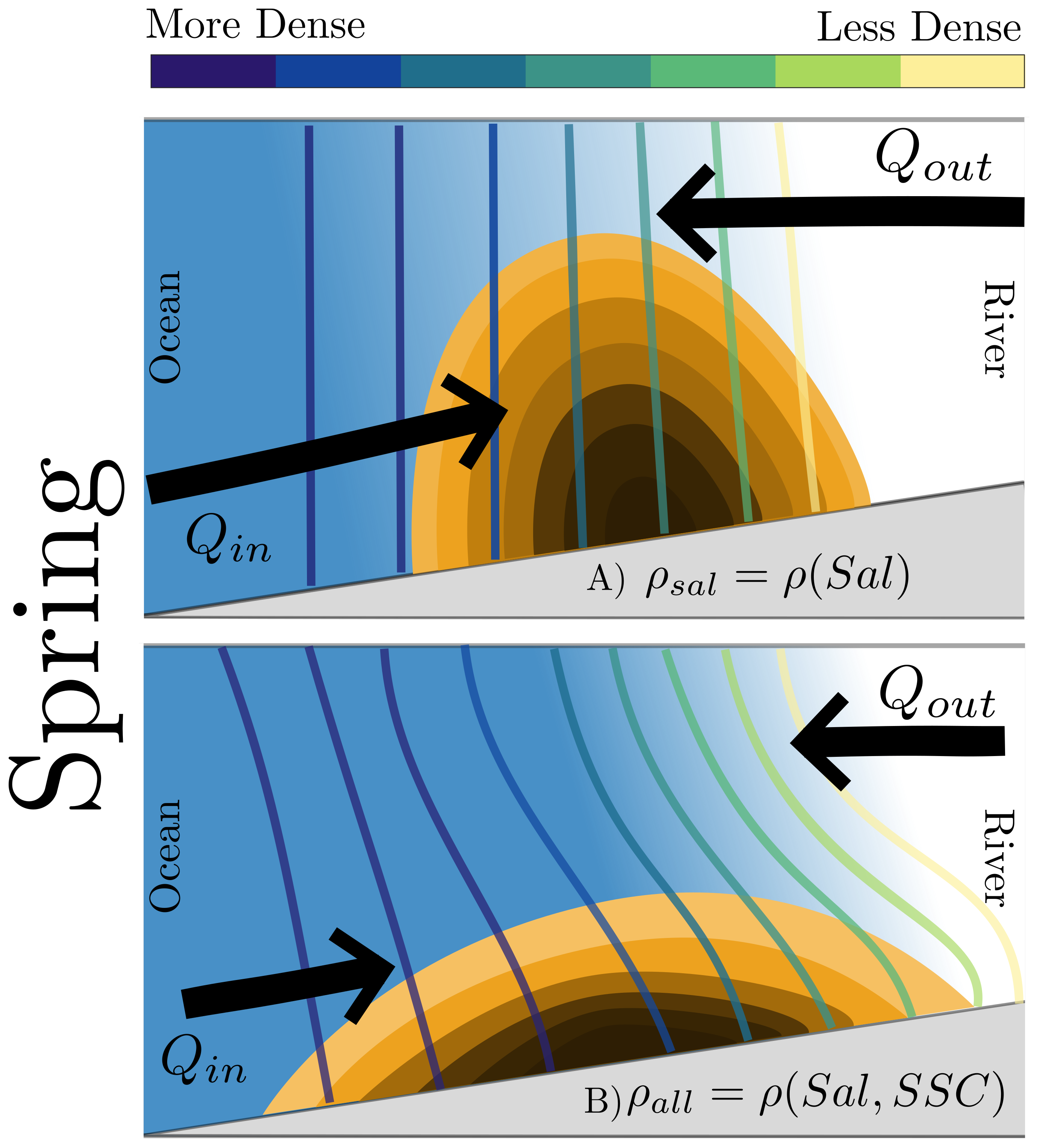 Figure 7 schematizes the changes due to SSC. The incorporation of SSC in water density calculations increases the stratification in the upper-reaches of the estuary. Despite these changes not being large, they decrease the depth-averaged longitudinal density gradient, which in turn allows for less intense exchange flows than when sediments are not included in density calculations (Fig. 7). The changes in the fortnightly variability of and at the ETM produces a near weekly modulation of the vertical density gradient (Fig. 4). Both the vertical and horizontal dynamics will ultimately be neglected when SSCs are not incorporated into water density calculations, causing overestimates of the exchange inflow Qin leading to incorrect assumptions about systems.