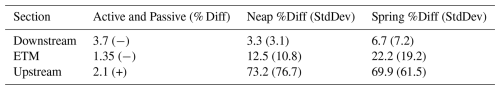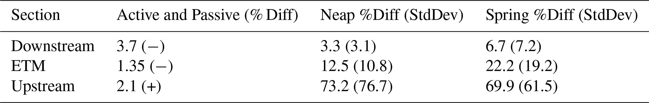 We have found that the omission of suspended sediments in the calculation of water density leads to differences in TEF values (Fig. 3 and Table 1). The percent difference of the bulk-values from the active to passive model when quantified over the entire study period (5 months) were found to be relatively small (less than 4 %), likely because of the enhancement of SSCs during only the spring tides, allowing for their contribution to be diminished when averaged over long time-periods. This was reinforced by the quantification of TEF bulk values during neap and spring tides separately, which have percent differences between the active and passive models that were considerably larger, specifically at the upstream location (up to 70 %).