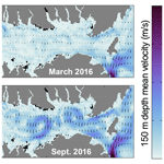 In Fig. 7a–f, we show March (panels a–c) and September (panels d–f) mean ocean velocity fields that are averaged through 150 m depth for the years 2014 (panels a, d), 2015 (panels b, e), and 2016 (panels c, f). We selected March and September to capture circulation in which Jones Sound is completely covered with sea ice and completely sea-ice-free. In March under full sea ice coverage, the flow field is quiescent, with strong inflow (up to 0.5 m s−1) through Fram Sound in the west and strong outflow (>0.5 m s−1) through Lady Ann Strait in the east. The strongest currents from northern Baffin Bay tend to flow east of Coburg Island; however, we do simulate weak flow of up to 0.2 m s−1 through Glacier Strait into Jones Sound. In September, however, reduced sea ice coverage allows atmosphere–ocean interactions, which drives the formation of persistent eddies that dominate circulation within Jones Sound (Fig. 7d–f). These eddies do not always form in the same place and rotate in the same direction. For instance, in 2014 (Fig. 7d), we model three sustained cyclonic eddies (rotating counterclockwise), where the easternmost eddy does not interact with strong inflow through Glacier Strait. In 2015 (Fig. 7e), we observe one anticyclonic eddy in the center of Jones Sound that is flanked by two cyclonic eddies, where circulation through Glacier Strait interacts with the easternmost eddy. Lastly, in 2016 (Fig. 7f), we model a similar eddy configuration as in 2015. The diversity of summertime circulation patterns across 2014–2016 in Jones Sound highlights the complex dependence of current patterns on inflow/outflow regimes and ocean–atmosphere interactions.