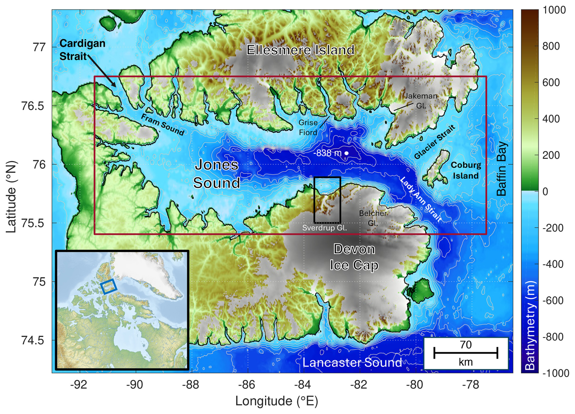 Jones Sound is home to the Inuit hamlet of Ausuiktuq (Grise Fiord) and is a marine region surrounded by glaciers draining large ice fields and ice caps on both the Ellesmere Island and Devon Island. It is the third largest export pathway in the CAA (Grivault et al., 2018; Melling et al., 2008; Zhang et al., 2016), connecting directly to the Arctic Ocean at the narrow (15 km) and shallow (150 m) western gateways of Hell Gates/Cardigan Strait (which merge into Fram Sound) and exchanging with Baffin Bay on the east side of the sound at a depth of 450 m (Fig. 1). The western half of Jones Sound is shallow, being ∼ 200 m depth, while the eastern basin is deeper, having a maximum depth of ∼ 840 m and greater exchange with external waterways. Aside from facilitating liquid exchange between the Arctic Ocean and northern Atlantic Ocean, Jones Sound also hosts a diverse biological ecosystem that is sustained in part by ice–ocean interactions of tidewater glacier termini as well as seasonally varying ocean and sea ice conditions (Bhatia et al., 2021). However, as part of the broader Arctic, Jones Sound is vulnerable to changing climate conditions that threaten these natural resources. For instance, Gardner et al. (2012) found that ice mass loss across the QEIs tripled from 31±8 Gt yr−1 in 2004–2006 to 92±12 Gt yr−1 in 2007–2009, largely driven by Arctic-amplified atmospheric warming that outpaces the global average by 3 times. Below the halocline within the Baffin Bay, mid-depth Atlantic Water (AW) that penetrates into the CAA and Arctic Ocean has been warming steadily since at least the early 2000s (Polyakov et al., 2013; Wang et al., 2020; Ballinger et al., 2022). This atmospheric and oceanic warming has also driven recent declines in sea ice extent, with the summer sea ice area in northern Canadian waters and Baffin Bay declining at a rate of 7.1 % per decade and 11.6 % per decade, respectively (Tivy et al., 2011). Given that sea ice serves as hunting platforms for polar bears, resting grounds and nursery areas for walruses and seals, and hosts for algae that grow on the ice base, these reductions in sea ice have cascading impacts on marine ecosystems.