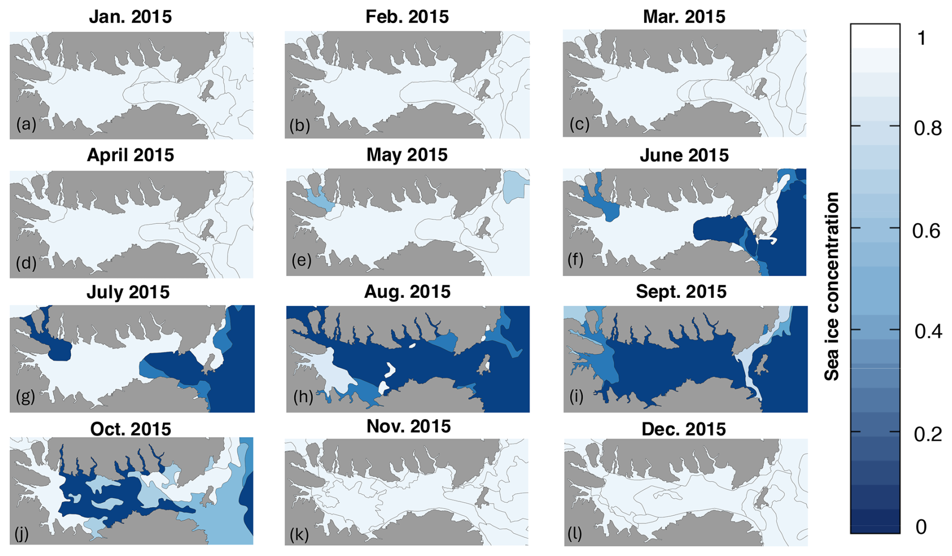 We further evaluate the sea ice model by comparing monthly observed (Fig. 4) and modeled (Fig. 5) timestamps of 2015 sea ice concentration. While we only show the 2015 sea ice cycle, we note that the other yearly cycles feature similar spatiotemporal patterns of annual change. Observed 2015 sea ice concentration fields are taken from the Canadian Ice Service and are created through manual analysis of in situ, satellite, and aerial reconnaissance data (Canadian Ice Service, 2009). We find generally good agreement between the observed and modeled sea ice concentration states within Jones Sound for the 2015 sea ice cycle, with complete sea ice coverage simulated across the domain between November–April and nearly complete melt-back of sea ice in August and September. Importantly, we also find that our model is able to replicate the spatial pattern of sea ice melt-back, with flow through Fram Sound initiating sea ice decline in northwestern Jones Sound and partial clearing of sea ice across southeast Jones Sound. We note that modeled sea ice thickness east of Coburg Island is overestimated and sea ice does not clear out of this region during the summer months, disagreeing with observations. As such, in Sect. 3.4, we only integrate sea ice quantities west of Coburg Island.