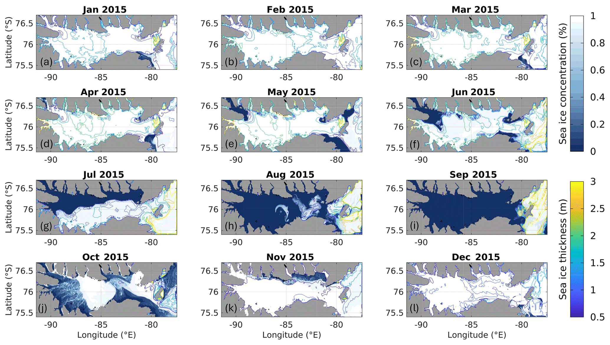 Sea ice is a prominent feature of ocean circulation and dynamics within Jones Sound, regulating the exchange of heat, moisture, and momentum between the ocean and atmosphere, as well as blocking the penetration of sunlight that fuels photosynthetic biological productivity. In Fig. 5, we plot monthly timestamps of grid cell sea ice concentration and contoured sea ice thickness during model year 2015. Sea ice undergoes a yearly cycle in which the sound becomes largely ice-free in September and completely full of ice in the winter months. Oceanic flow through Fram Sound initiates sea ice decline in northwestern Jones Sound, typically beginning in April. Sea ice then retreats south across Jones Sound, clearing within the northern fiords first and then melting back across the rest of the sound by September. While most of the sound remains ice-free in September, Coburg Island acts as a sea ice bottleneck in our model (and in observations), trapping ice that circulates between the open waters of Baffin Bay and the confined waters of Jones Sound. During the winter, sea ice thickness generally fluctuates between 1–2 m across most of the sound. However, there are isolated pockets of thicknesses > 4 m, which are primarily constrained to within narrow fiords, along the periphery of Coburg Island, and in the open waters of Baffin Bay. This thick sea ice along Coburg Island and within Baffin Bay is not supported by observations and represents a model bias. We note that while we only show the 2015 sea ice cycle, these general patterns persist in other modeled years.