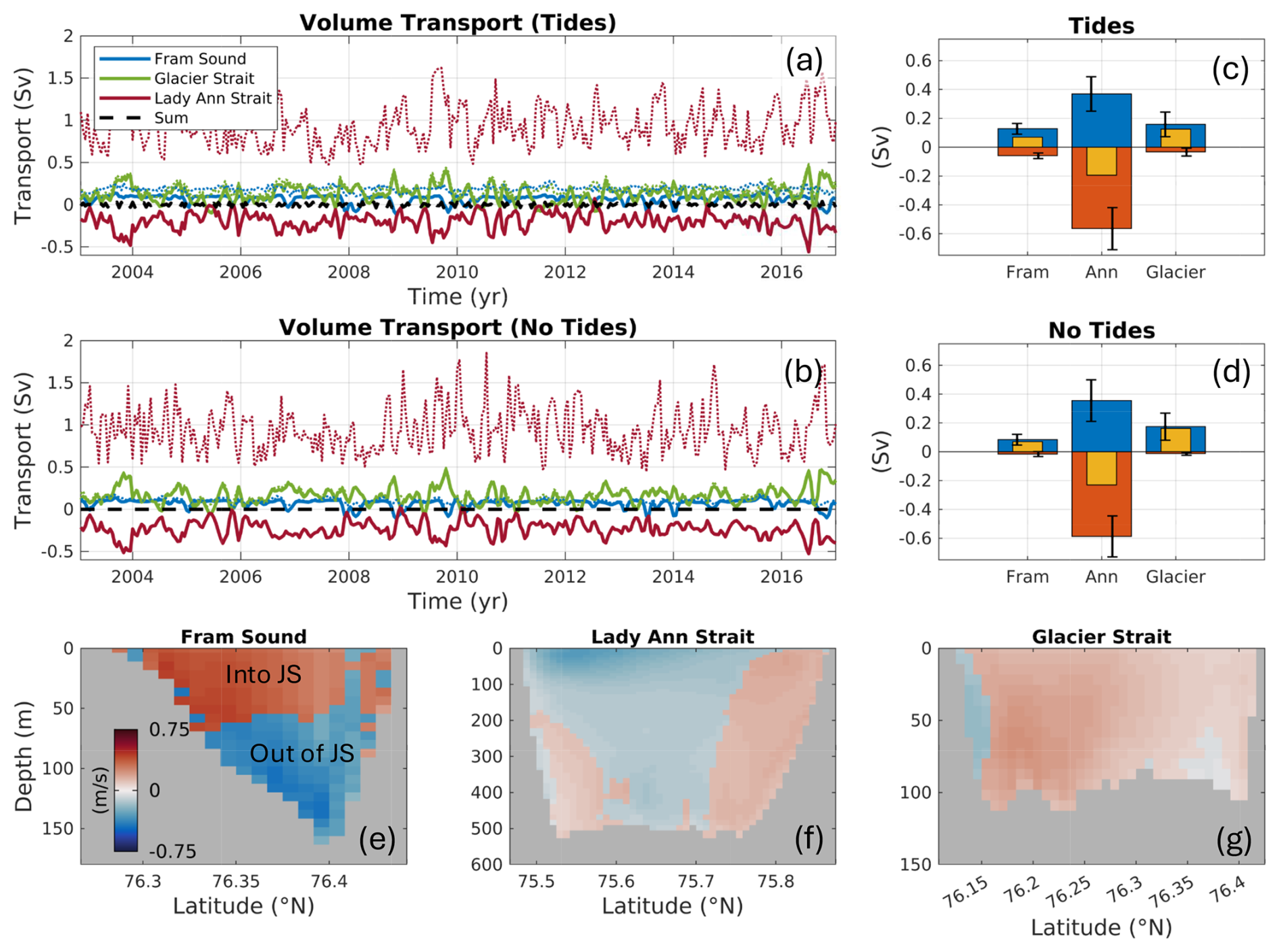 Figure 6Time series of net transport (solid lines) and the magnitude (dotted lines) of volumetric transport through Fram Sound (blue), Glacier Strait (green), and Lady Ann Strait (red) with (a) tidal forcing included and (b) tidal forcing not included. Positive and negative values indicate transport into and out of Jones Sound, and note the different y-axis limits between the two panels. (c–d) Bar plots of the time mean transport into (blue) and out of (orange) Jones Sound, with the mean net transport indicated by the yellow bar. Panel (c) includes tides and (d) does not include tides. Error bars indicate 1 standard deviation from the mean. (e–f) Vertical cross sections of time mean ocean velocity through (e) Fram Sound, (f) Lady Ann Strait, and (g) Glacier Strait.