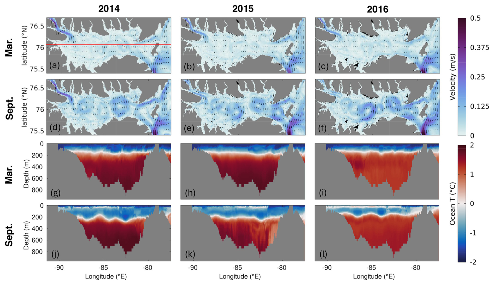 These circulation patterns influence the thermodynamic structure of the water column within Jones Sound. In Fig. 7g–l, we plot vertical temperature profiles across Jones Sound at 76° N (red line in Fig. 7a). As in the velocity fields, the third and fourth row of the figure correspond to March and September mean temperature fields, and the first, second, and third columns correspond to 2014, 2015, and 2016 fields, respectively. In all temperature fields, we note that the modeled thermal structure is homogeneous beneath the thermocline, as has been observed in Jones Sound (Fig. 3i). Under complete sea ice coverage, the modeled thermocline is nearly uniform at a depth of ∼ 100 m across Jones Sound (Fig. 7g–i). In September, the development of eddies drives spatial variation in the modeled depth of the thermocline, with the location of the eddy centers corresponding to locations of thermocline upwelling and downwelling. In September 2015, we see that the thermocline is nearly uniform at ∼ 200 m depth across Jones Sound, which is ∼ 100 m deeper than the March thermocline depth.