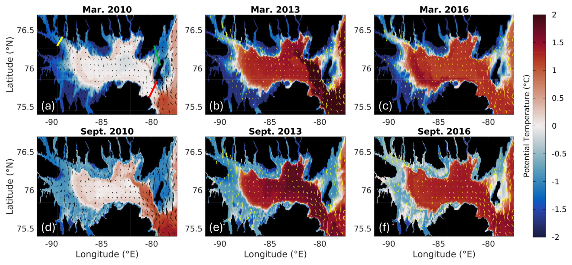 Figure 8Modeled ocean bottom potential temperature (shaded) and velocity (vectors) in Jones Sound, Canadian Arctic Archipelago. The top row shows fields in March of (a) 2010, (b) 2013, and (c) 2016, while the bottom row shows fields in September (d) 2010, (e) 2013, and (f) 2016. In (a), the yellow, red, and green lines denote the location of the vertical cross sections through Fram Sound, Lady Ann Strait, and Glacier Strait that are shown in Fig. 6e–g, respectively.