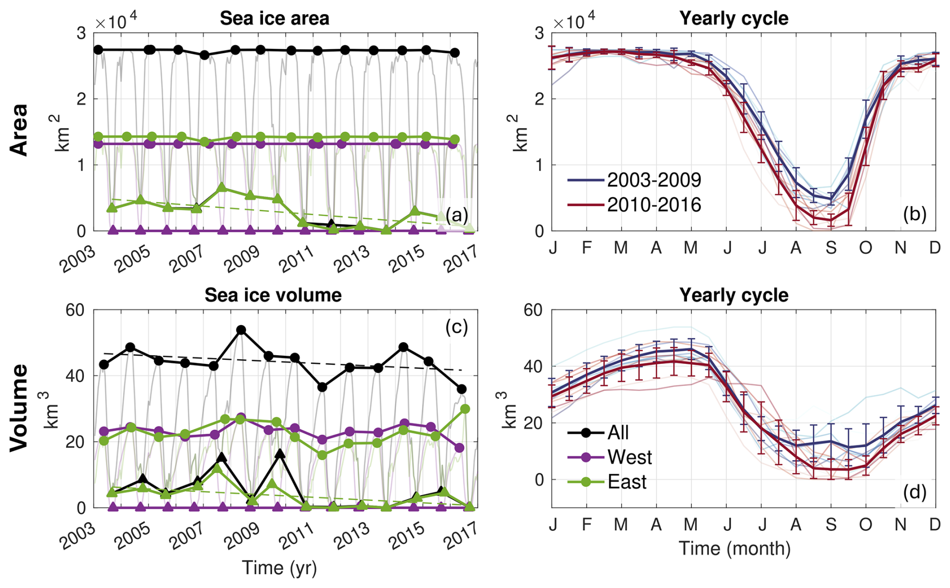 Figure 9Integrated sea ice (a–b) area and (c–d) volume. In (a) and (c), marker colors correspond to the area of integration: black (all of Jones Sound), purple (western Jones Sound), and green (eastern Jones Sound). Circles and triangles denote yearly sea ice maxima and minima. Best-fit lines are overlaid on the eastern Jones Sound area and volume minima (green dashed lines) and the full Jones Sound volume maxima (black dashed line) to show long-term trends. In (b) and (d), the 2003–2009 and 2010–2016 mean yearly cycles and standard deviations are plotted as the blue and red lines, respectively. Each yearly cycle is overlaid as transparent blue or red lines.