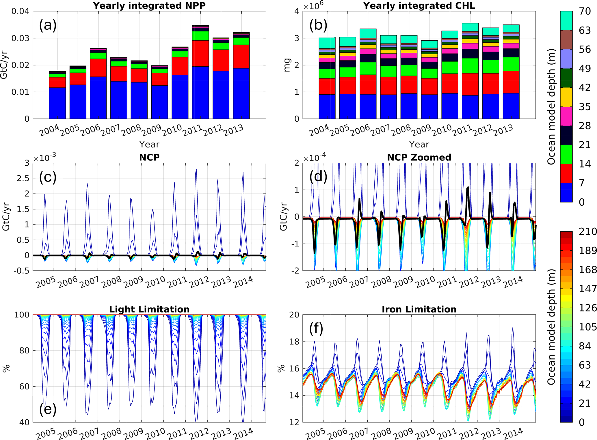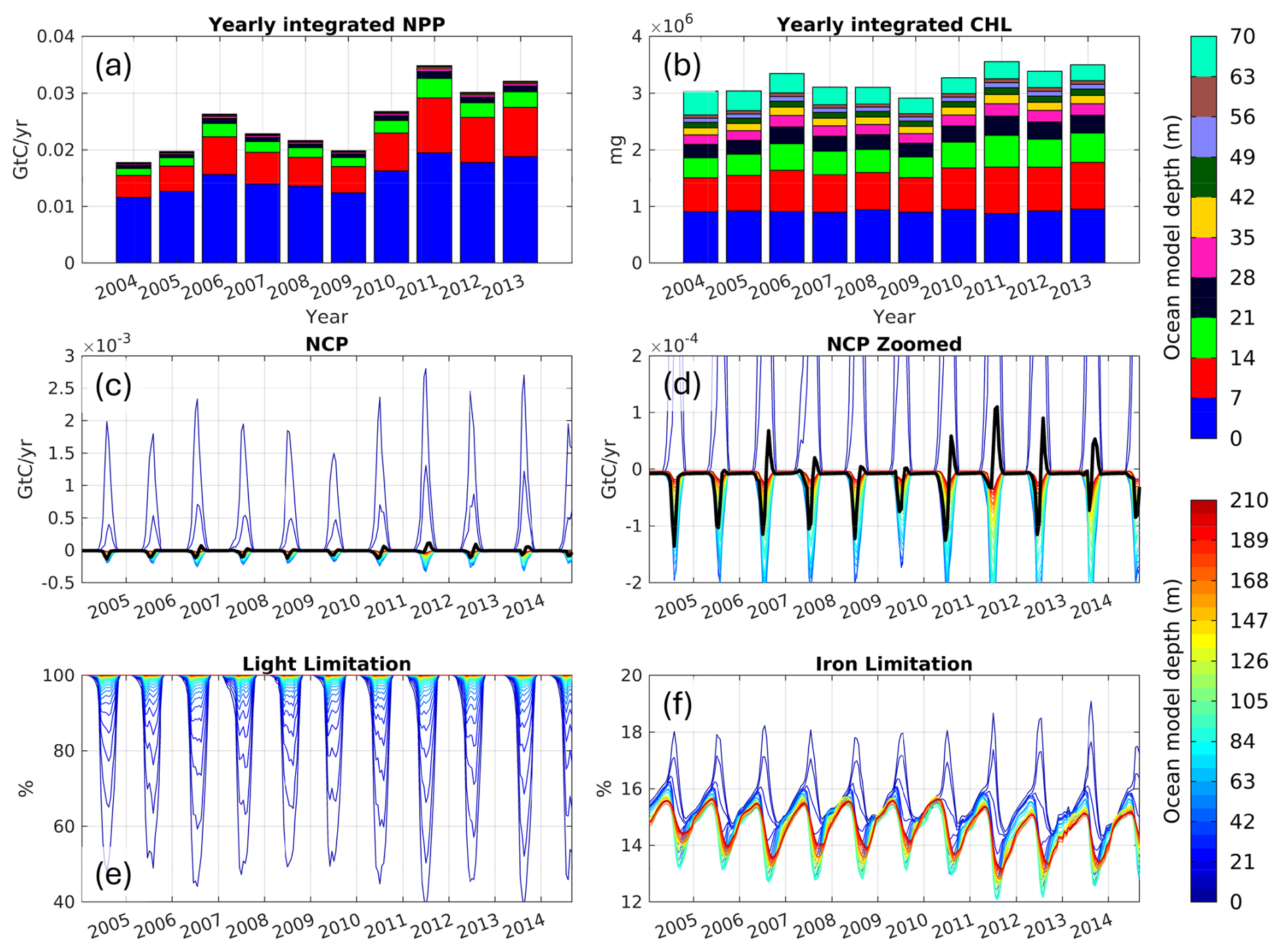 Figure 10Bar plots of yearly and depth-binned (a) net primary productivity and (b) chlorophyll. Panels (c)–(d) show time series of net community productivity integrated on the top 20 vertical ocean levels (through 140 m depth), where the bold black line in (d) denotes values for the third vertical ocean level (17.5 m depth). Panels (e) and (f) show the percent of ocean grid cells per each vertical level that are light- and iron-limited, respectfully.