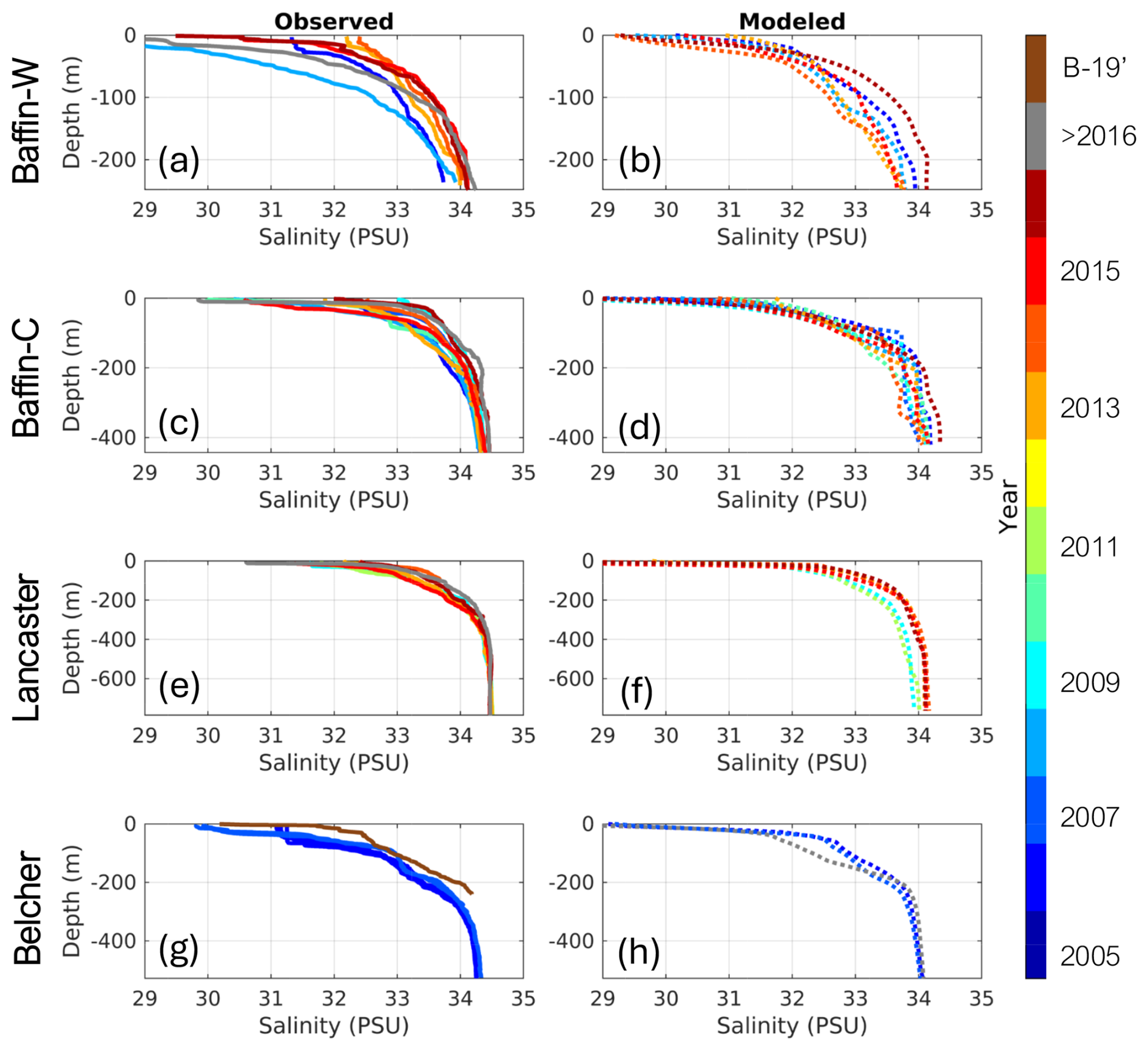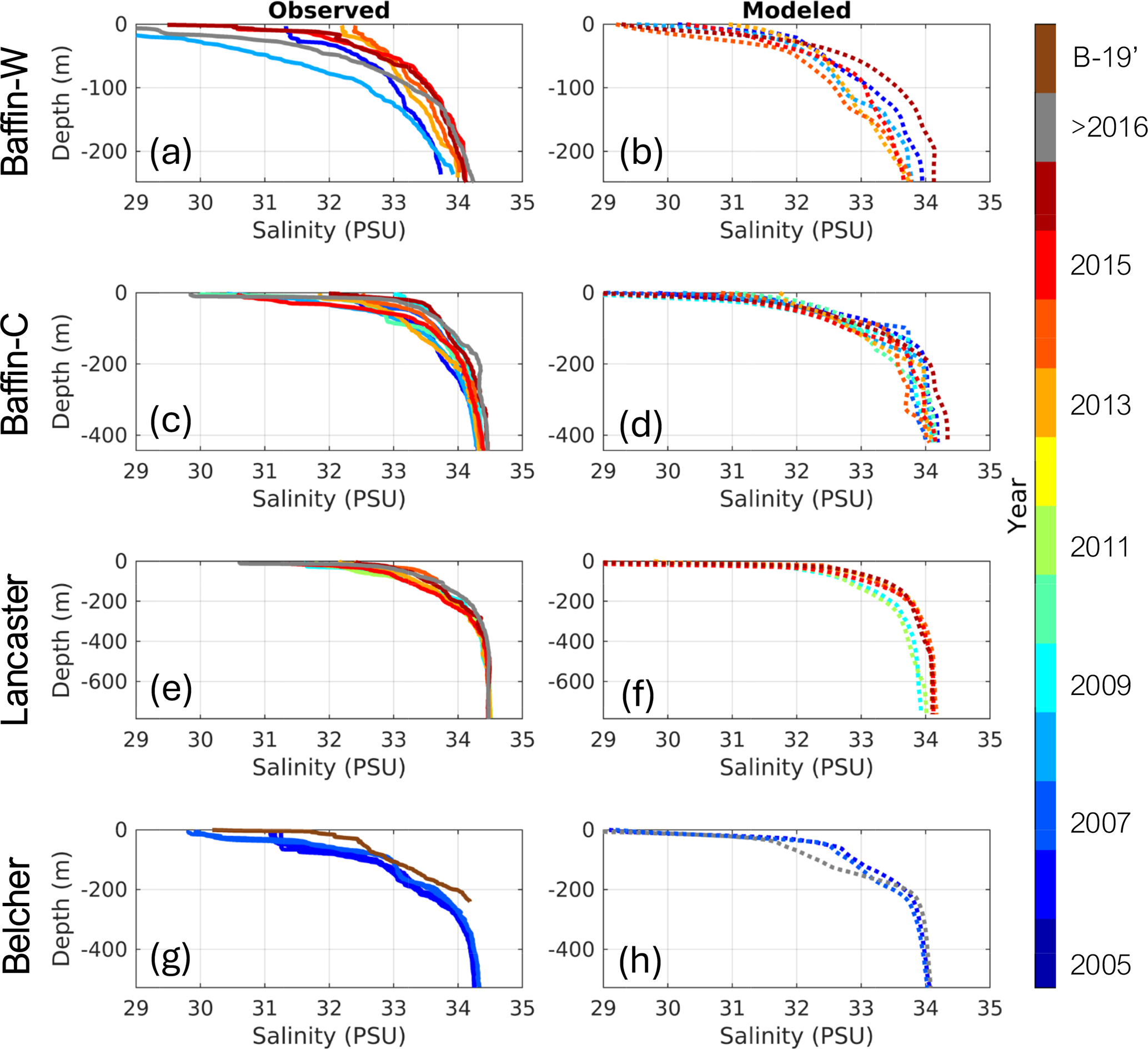 Figure 3Comparison of observed (a, c, e, g, solid lines) and modeled (b, d, f, h, dotted lines) ocean temperature vertical profiles taken in western Baffin Bay (a–b), in central Baffin Bay (c–d), at the eastern entrance of Lancaster Sound (e–f), and near Belcher Glacier (g–h). The color of the line indicates the year of the profile, and gray denotes any profile taken after 2016. Observations are summertime CTD rosettes taken aboard the Amundsen icebreaker (Amundsen Science Data Collection, 2003–2021), and the brown line in (b) is a profile from Bhatia et al. (2021) that was taken in summer 2019 (B-19'). (i–j) Temperature–salinity plots taken in (i) 2019 in Jones Sound and (j) 2015 in the eastern entrance of Lancaster Sound. The color of the marker corresponds to the depth. The observed and modeled profiles are labeled.