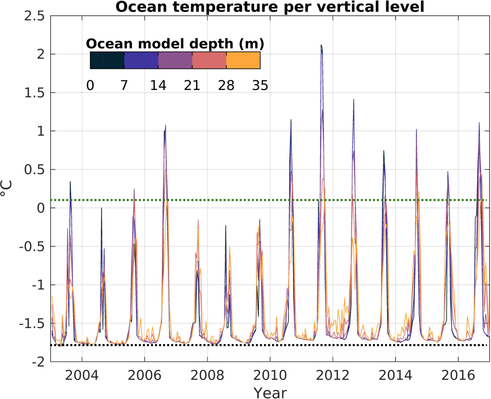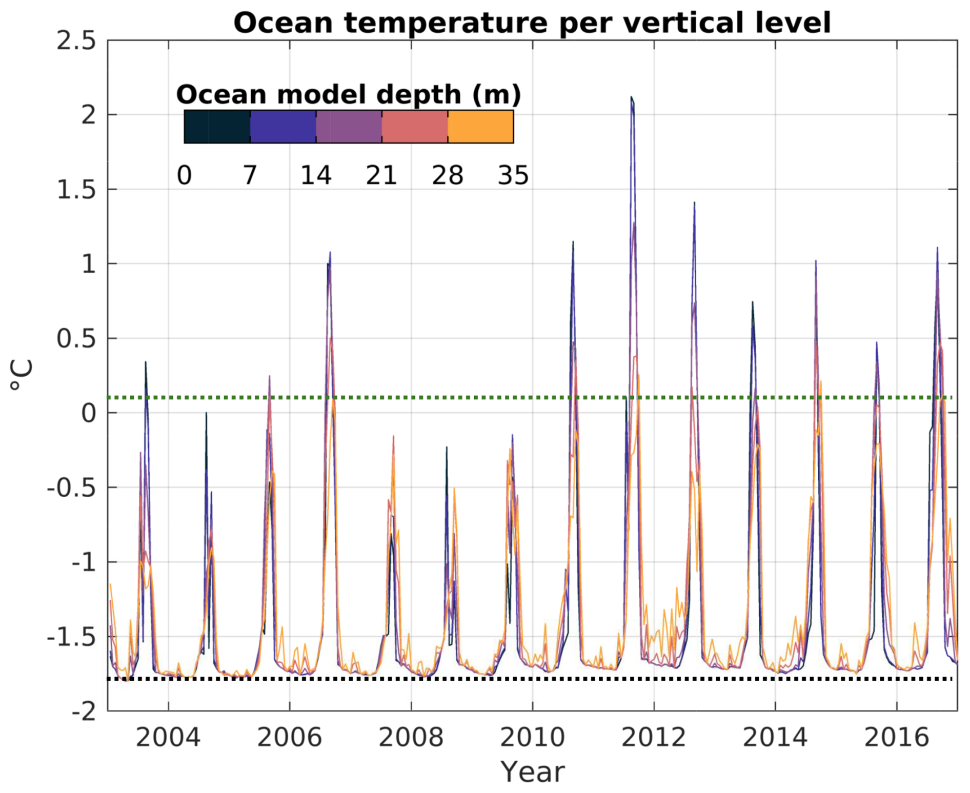 Along the ocean model boundaries, we find large changes in the ocean state between 2002 and 2016 as simulated by the ANHA12 configuration of NEMO, from which we extract our ocean boundary conditions. Figure A1 in Appendix A1 shows vertical profiles of ocean potential temperature applied to the eastern boundary (−74° W) of the low-resolution ocean simulation in January of 2002, 2007, 2012, and 2016. A strong warming signal of the winter mid-depth Atlantic Water (between 100–300 m depth) is evident after 2007, where waters warm by over 2 °C in ∼ 10 years in this simulation. We note that this simulated warming signal of the Atlantic Water is overestimated, as oceanic observations taken on the Arcticnet Amundsen icebreaker report 1–1.5 °C of warming of this water mass in northern Baffin Bay over this same time period. We discuss the implications of this overestimated ocean warming in the Discussion section.