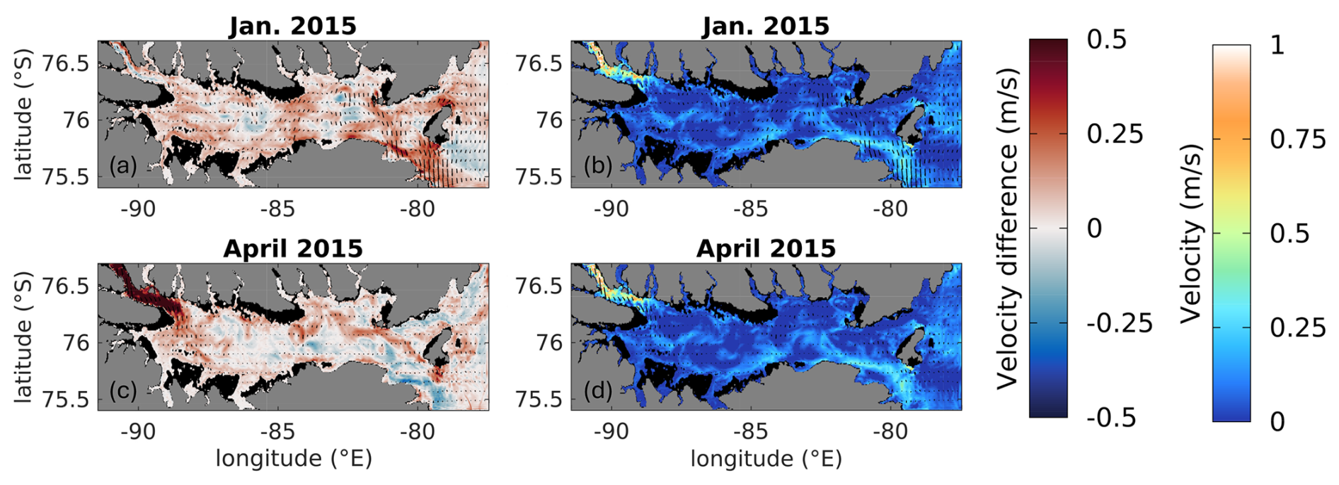 Figure A6Magnitude (b, d) and difference (a, c) in 50 m ocean velocity in (a–b) January 2015 and (c–d) April 2015 between model runs with and without tides (red shading denotes where tidal forcing results in faster ocean velocities). Black shading denotes bathymetry above 50 m, and land is shaded in gray. Absolute velocities in (b) and (d) are taken from the model run with tides.