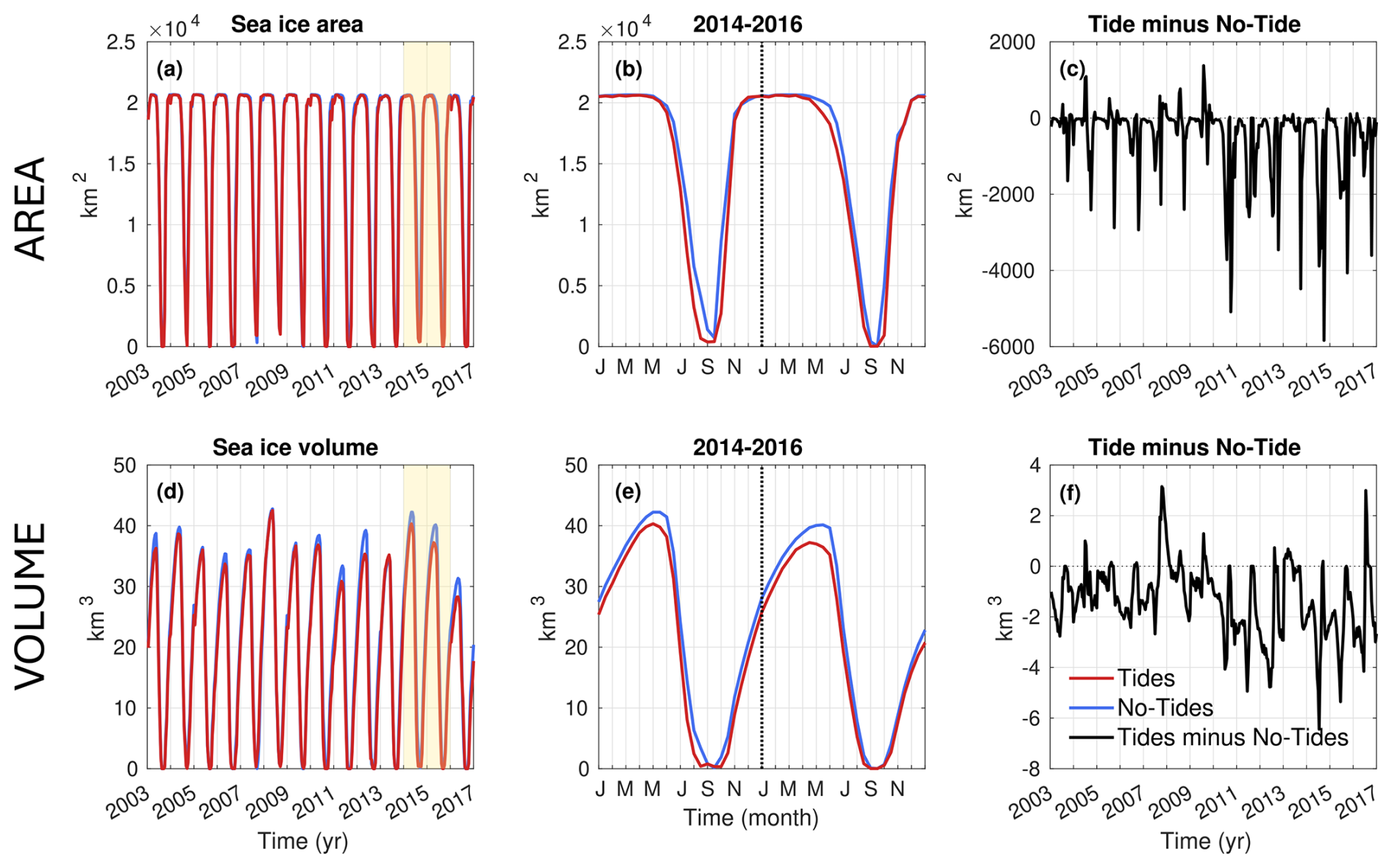 Figure A8Jones Sound integrated sea ice area (a–c) and volume (d–f) time series, where red and blue lines represent results from the tidal and non-tidal simulation, respectively. Panels (b) and (e) are zoomed into the 2014–2016 sea ice cycle in (a) and (d), respectively. In (c) and (f), the black line denotes the difference of the tidal and non-tidal time series.