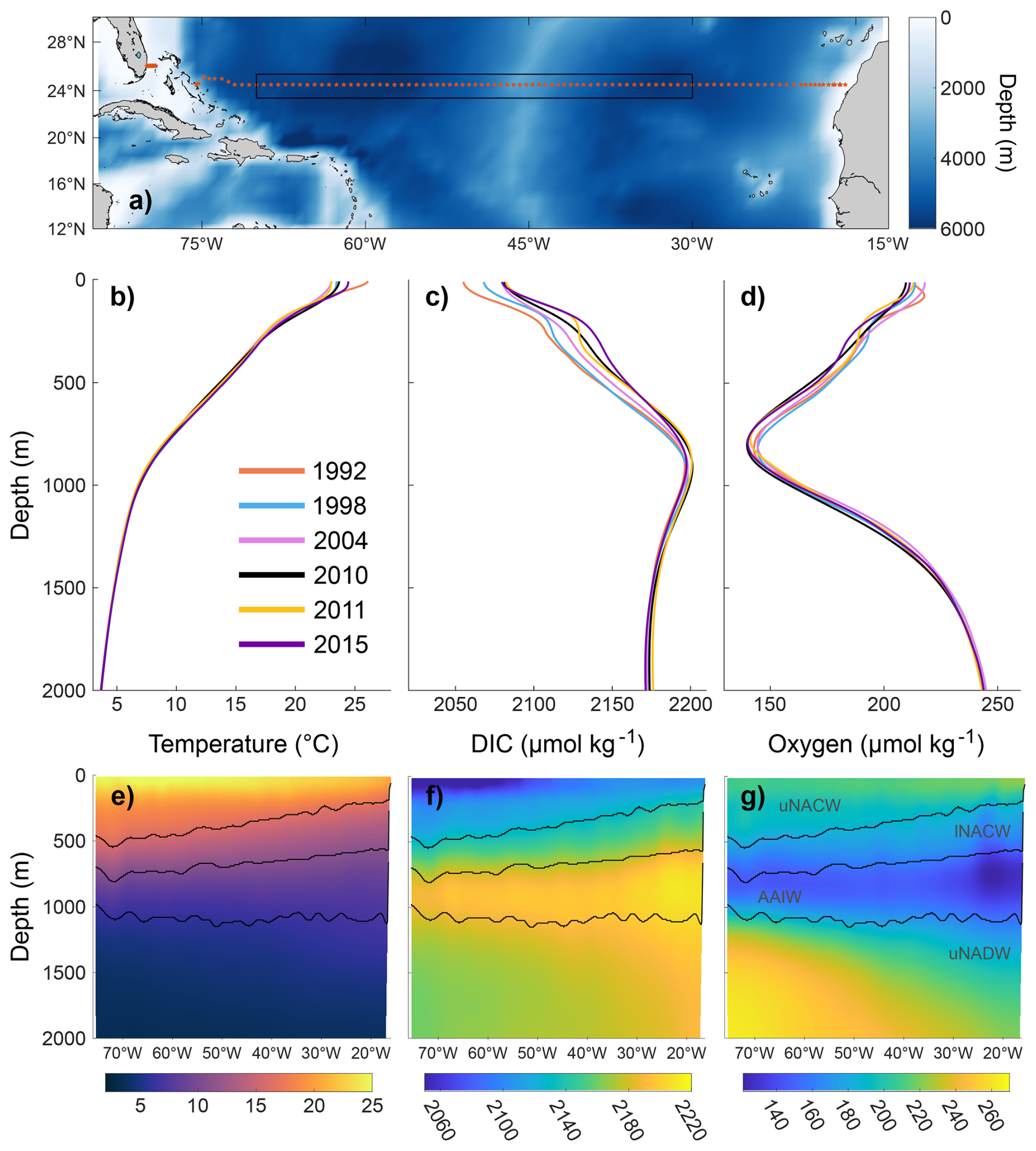 Figure 1(a) Map of the A05 cruise transect overlaid on background bathymetry (m) (NOAA National Centers for Environmental Information, 2022). Red markers show the positions of the CTD stations occupied in 1992, and the black box is the central region, averaged over in (b)–(d) The spatially-averaged (b) potential temperature (°C), (c) DIC (µmol kg−1) and (d) oxygen (µmol kg−1) profiles of the A05 section for the six cruises between 1992 and 2015. (e–g) The temporal average of the same properties, with contours showing the upper (uNACW, σ0<26.7 k m−3) and lower North Atlantic Central Water (lNACW, 26.7 kg m kg m−3), Antarctic Intermediate Water (AAIW, 27.2 kg m kg m−3), and upper North Atlantic Deep Water (uNADW, σ0>27.6 kg m−3 and σ2<37 kg m−3) based on definitions in Guallart et al. (2015) and labelled in (g).