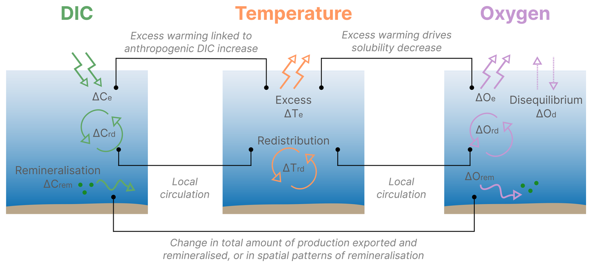 These mechanisms are shown schematically in Fig. 2. By linking each of these mechanisms to simultaneous changes in temperature and DIC, we develop a set of equations that can be solved to calculate the magnitude of each process. The total temperature change is the sum of only excess and redistributed temperature changes, while total DIC change is defined as a sum of the excess, redistributed and remineralisation changes of DIC. Excess DIC change is dominated by the anthropogenic increase (Turner, 2024), and has an associated temperature change. Isolating this excess change means that we can also calculate the remaining redistribution component of temperature change. Since the redistribution of all three properties is driven by local changes in stratification (or distribution of water masses), we can use the redistribution of temperature to calculate the redistribution of DIC and oxygen. The remaining DIC change, due to the production of DIC during remineralisation, is connected to the associated loss of oxygen. The disequilibrium oxygen term remains weakly constrained as it is not directly linked to another process. A disequilibrium term is not included for DIC because, while disequilibrium does affect surface CO2 concentrations, this term is instead incorporated in the coefficient relating any excess DIC and temperature changes, described in Sect. 2.3.