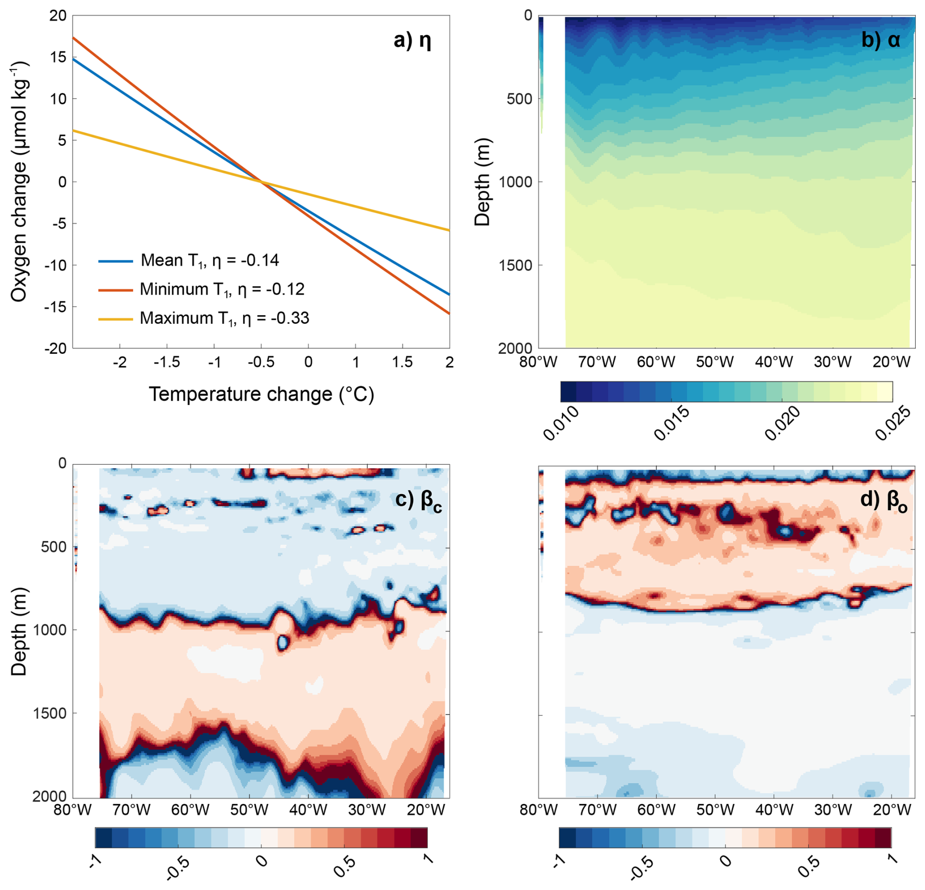 The excess change in temperature can be linked to both the excess change in oxygen and in DIC. Excess changes in oxygen are driven by excess changes in temperature via changes in solubility, described by the coefficient η: