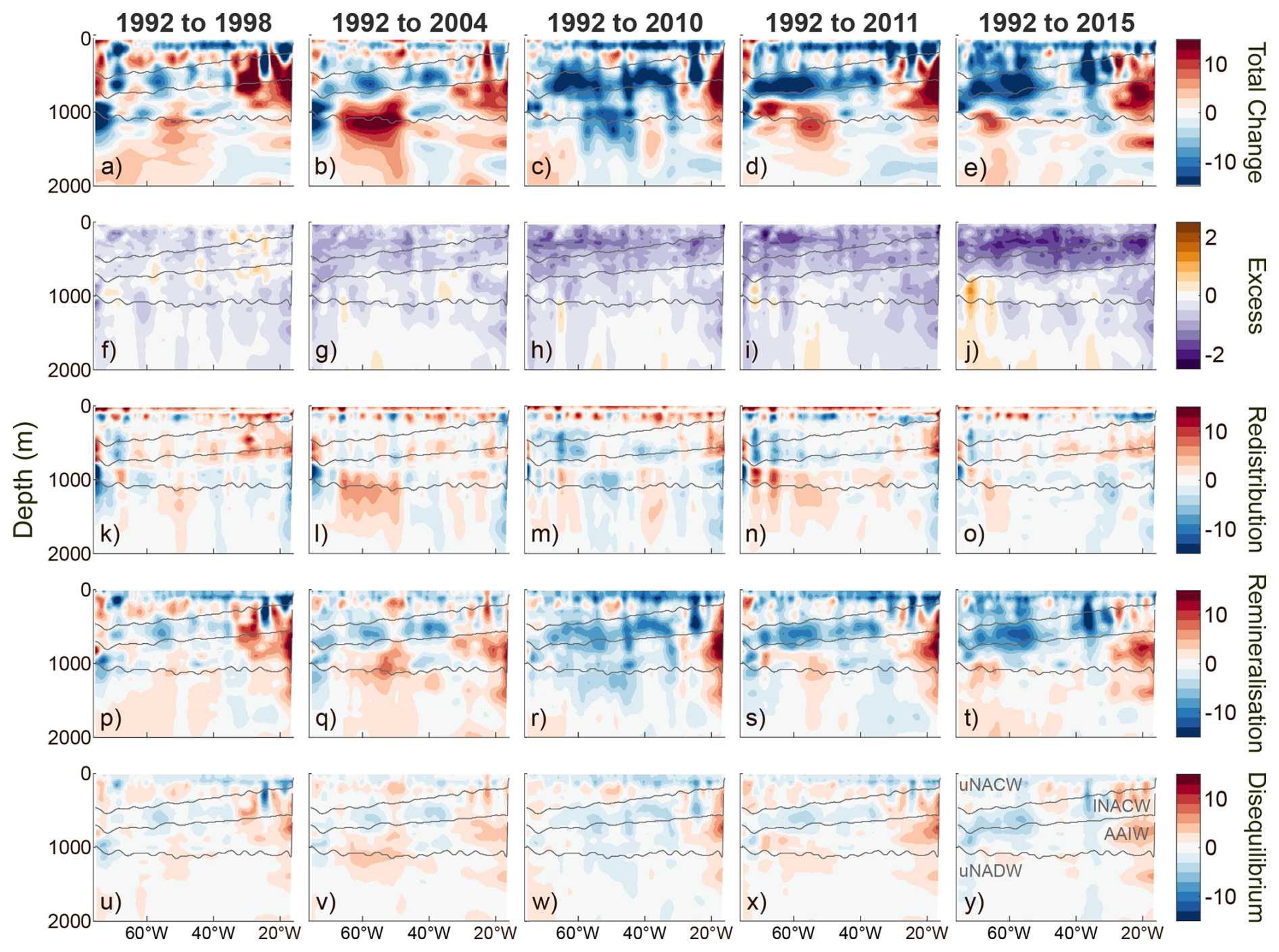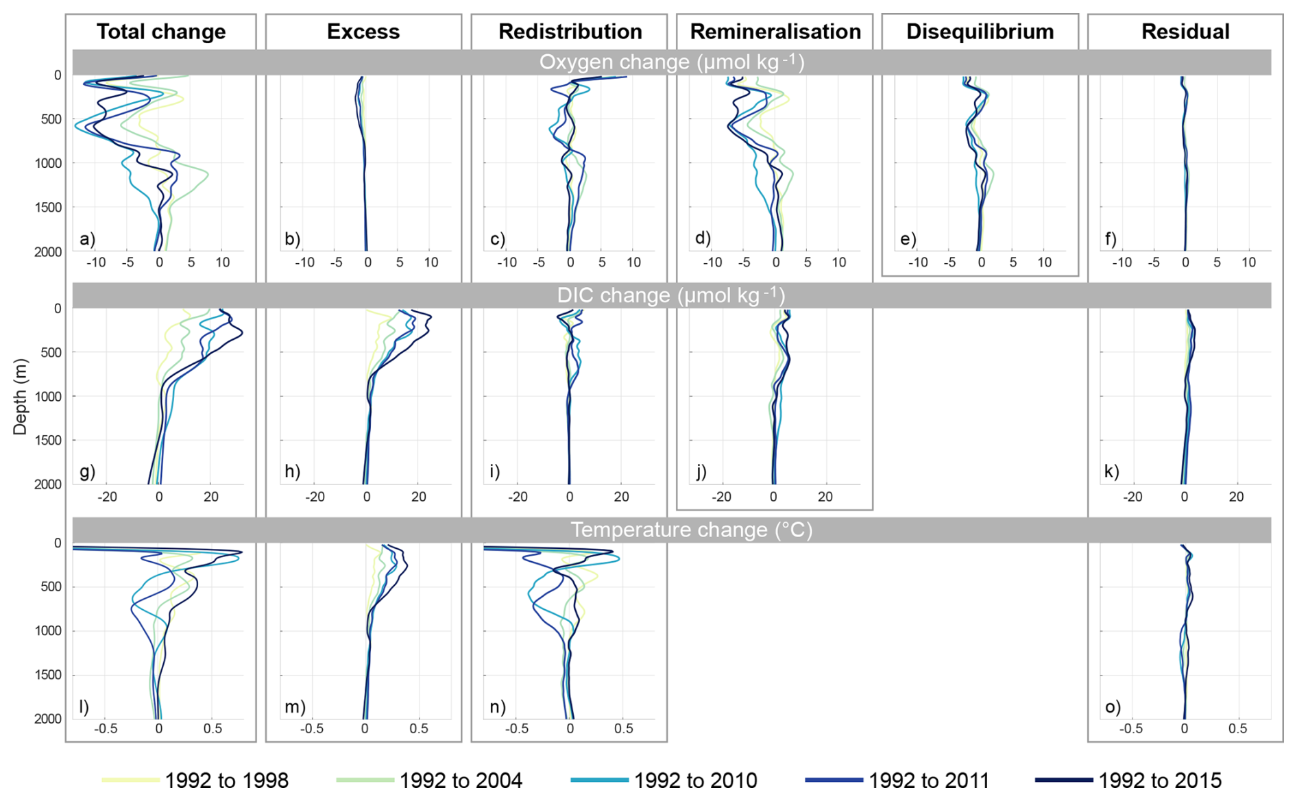 Redistributed changes in oxygen are less consistent with time than the excess signal (Fig. 5c), reflecting local circulation patterns with no apparent trends. The lines of near-zero redistribution close to the surface and at a depth of around 800 m (Fig. 4k–o) are simply due to the change in sign of the βo coefficient as it switches from positive to negative, and have no correlation with any particular water masses. At this depth, redistribution has no effect on oxygen because the depth gradient is zero. Patterns of disequilibrium oxygen change are relatively similar to those of the total oxygen change, but with considerably lower absolute values (Fig. 4u–y). When averaged across the central region of the section, the maximum magnitude is only −2.37 µmol kg−1 at depths of ∼600 m between 1992 and 2010 (Fig. 5e). Since there is no direct link between the disequilibrium change and any of the DIC or temperature terms, the term is weakly constrained, making analysis more challenging. The similarity between the total change is likely because it is a residual term, and so will have a larger magnitude when the total change is greater.