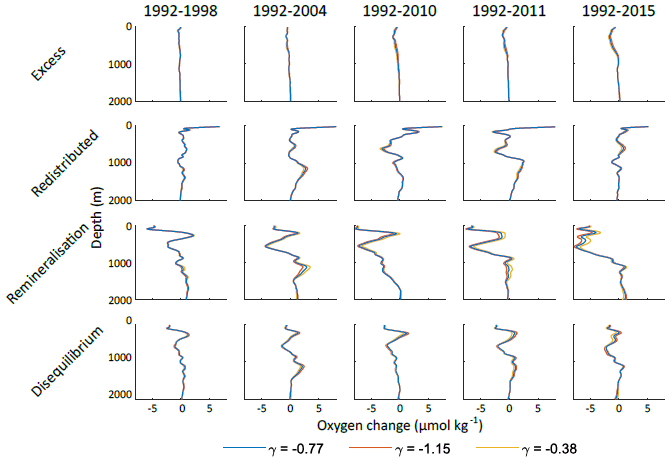 The ratio γ between oxygen and DIC is tightly constrained based on interior tracer fields, and while there will be some spatial changes in this ratio, within the Atlantic, the remineralisation ratio between oxygen and carbon can be considered constant with depth (Li and Peng, 2002). While variation in the Redfield ratio was tested, changing the value by as much as 50 % has little impact on the overall findings (Fig. B1).