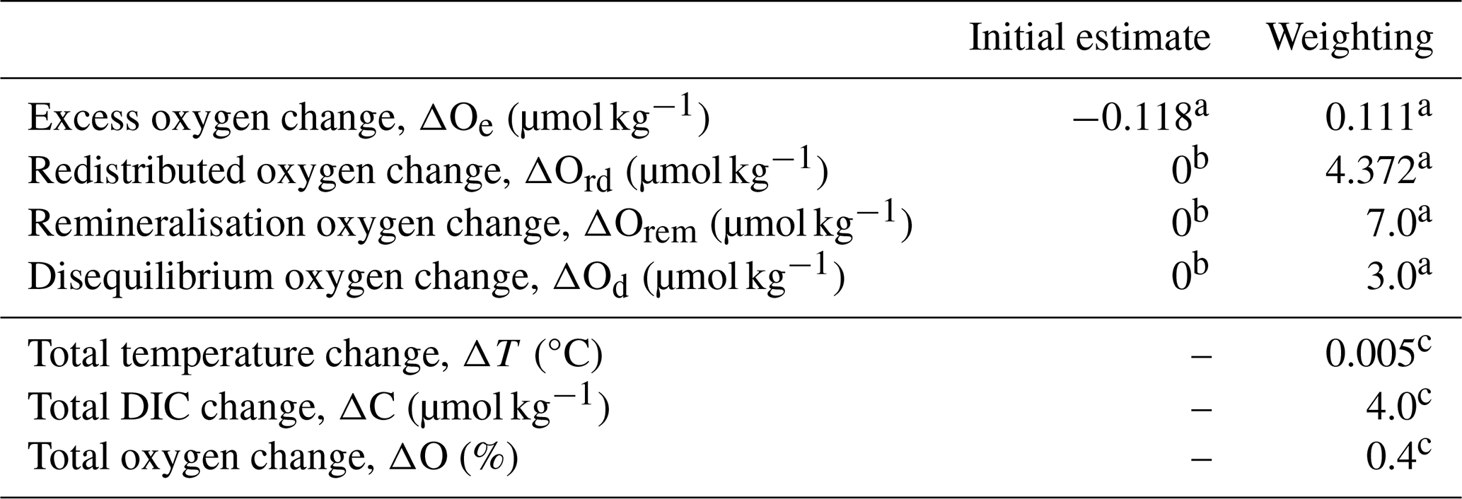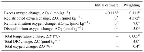 Table 1The values used to regularise each variable in Eq. (12) when calculating the decomposition of the oxygen change. a The weightings and initial estimate for each individual oxygen components defined as the expected mean and standard deviation respectively, taken from literature. b When no previous information is available, the initial estimate is set to zero. c The weightings for the total variable changes come from the approximate consistency between GLODAP cruises, with the oxygen weighting changing spatially since it is given as a percentage.