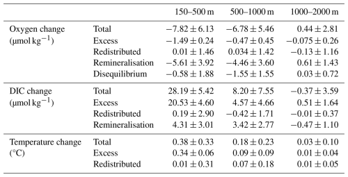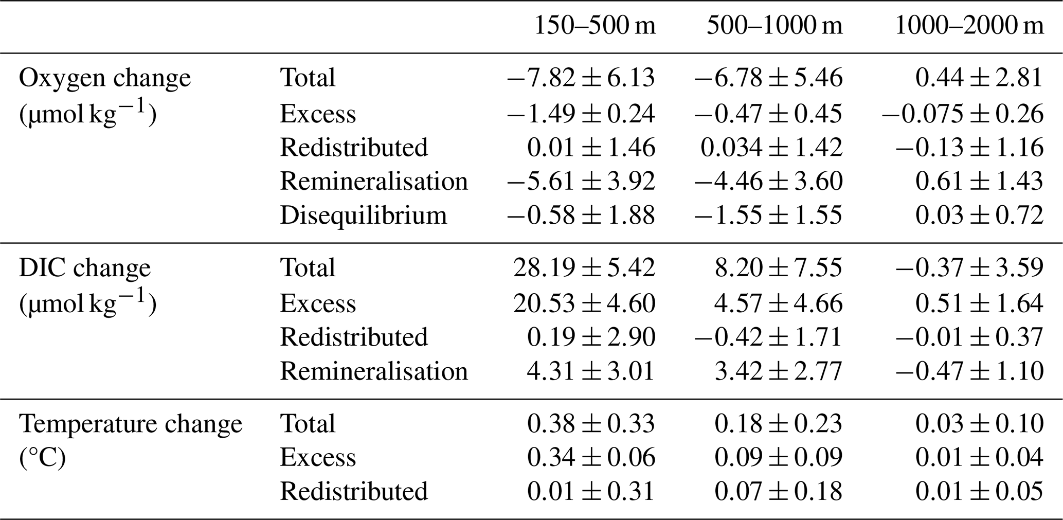 There is variation in the driving mechanisms of oxygen, DIC and temperature change at different depths. Averaging over depth ranges also shows high standard deviation at depths below 1000 m (Table 2). In the depth range 150–500 m total deoxygenation is dominated by change in remineralisation, while the DIC increase is dominated by excess change, and a slight warming is driven by excess change. The dominance of one process is less evident in the depth range 500–1000 m. Remineralised oxygen change still makes up the majority of the deoxygenation, while for DIC, the remineralisation term becomes more significant, with an average of 3.42 µmol kg−1 compared to a total DIC change of 8.20 µmol kg−1. Within this depth range, the average temperature change is less than the standard deviation, with both excess change and redistribution driving a similar size increase.