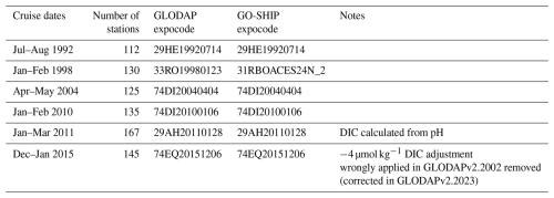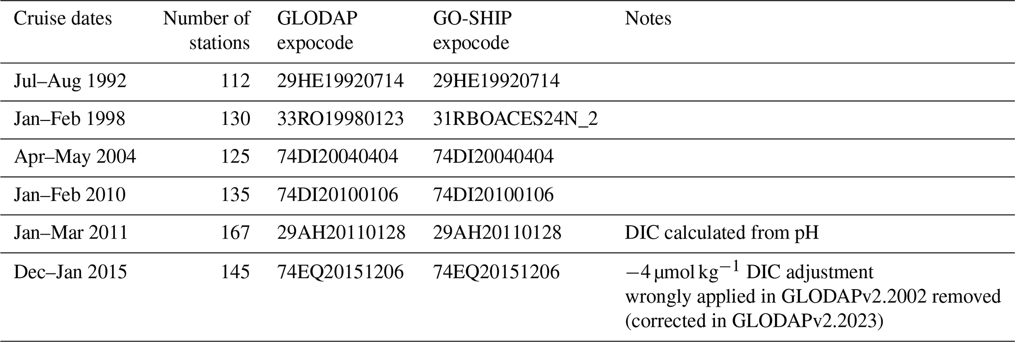 Table A1Additional information about the six cruises on the A05 section between 1992 and 2015. The data collected during each cruise was collected and analysed using standard operating procedures as outlined in the GO-SHIP manuals (Langdon, 2010; Dickson et al., 2007).