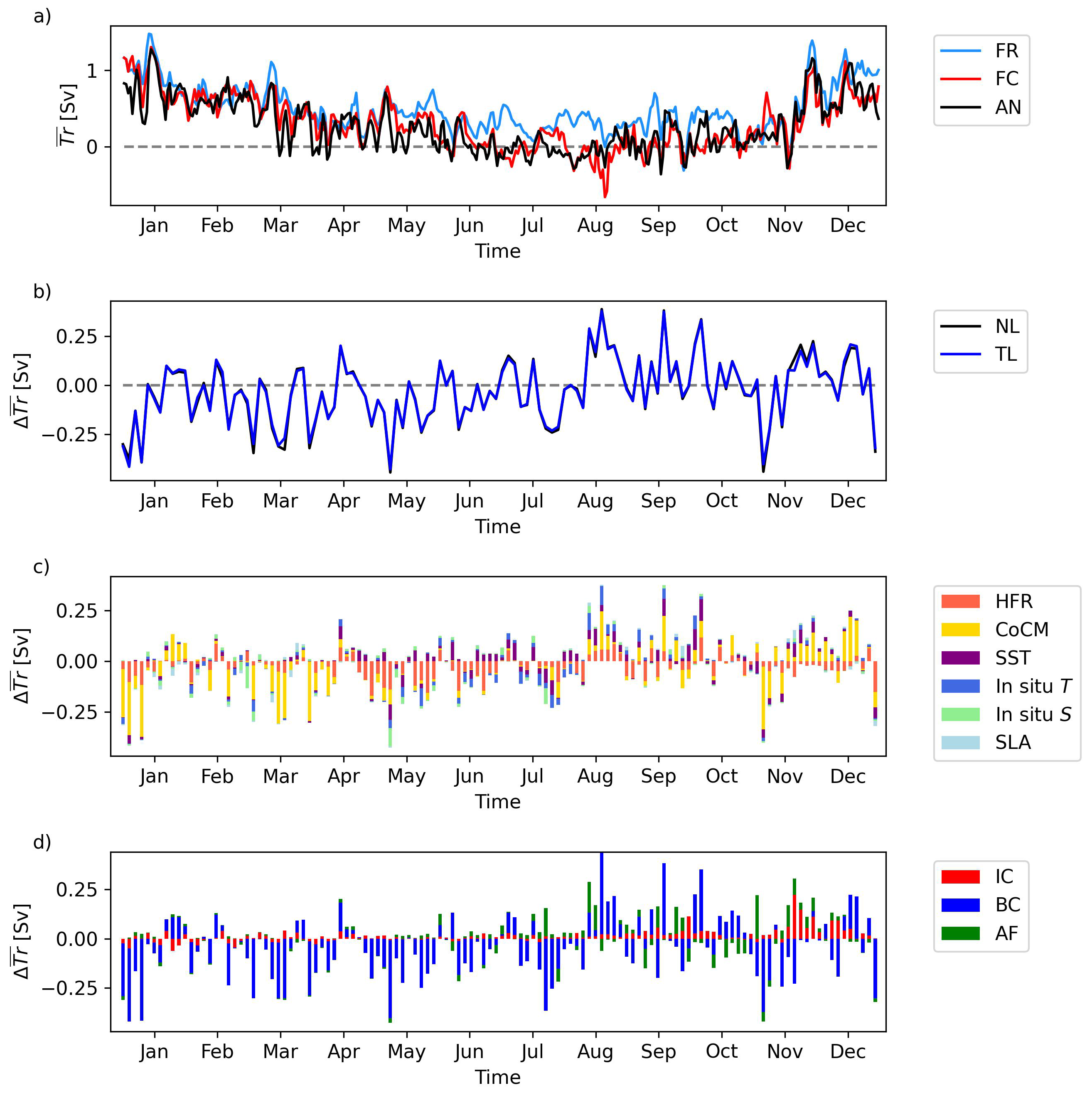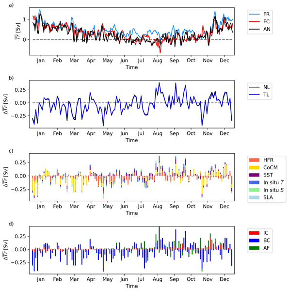 The contribution of each observation type to changes in the total northward transport is shown in Fig. 6c, as detailed in Sect. 2.3. Observations from the CoCM have the largest overall impact on the transport increment, followed by HFR, SST, in situ T and S, and SLA. The relative impact of observation types also varies seasonally: CoCM data dominate during winter and autumn, while HFR observations have a greater influence during spring and summer. No clear seasonal pattern is observed for the remaining data sources.