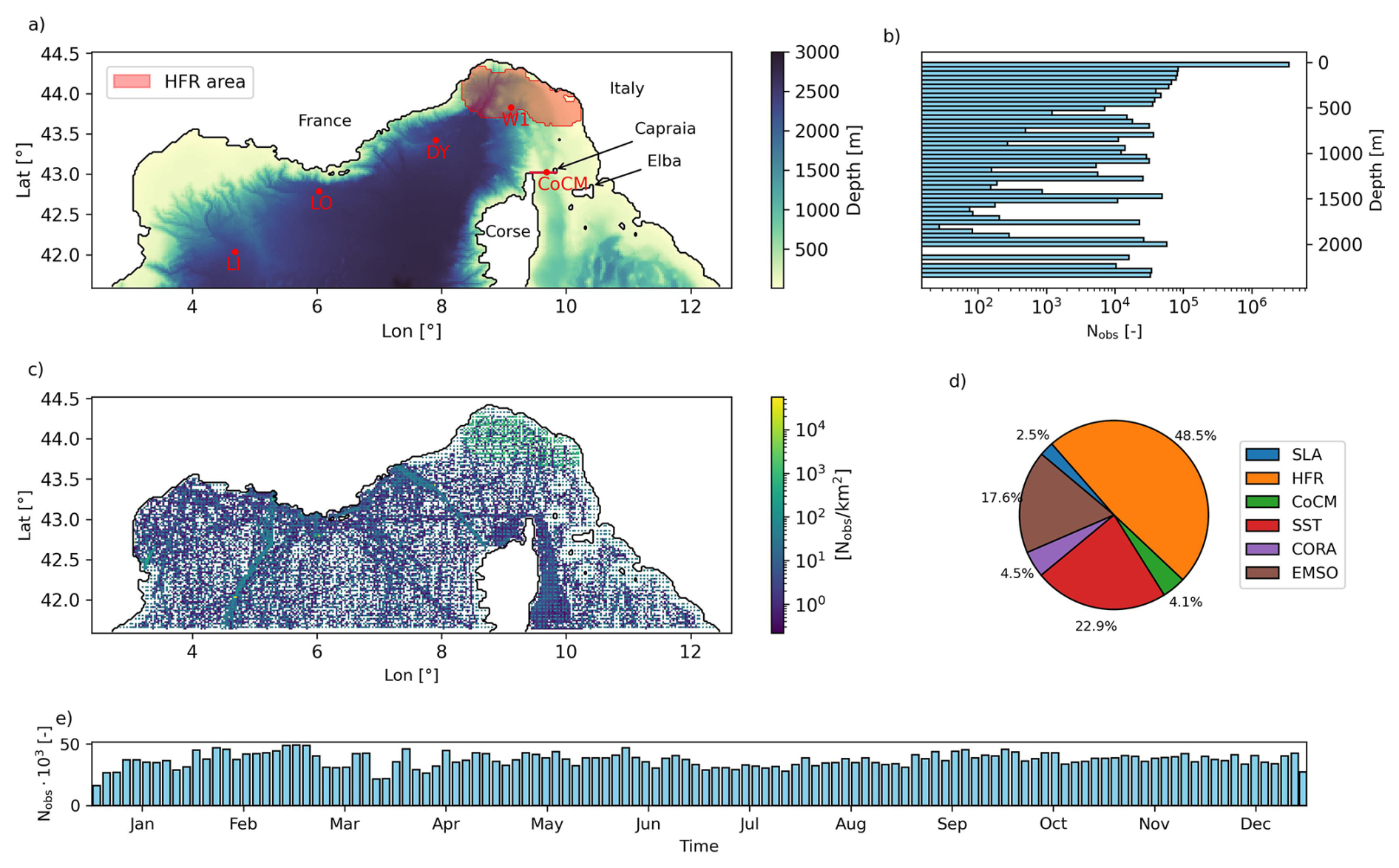 Figure 1(a) Model domain and bathymetry. Red dots represent the mooring stations from EMSO (LI: Lion, LO: Albatross, DY: Dyfamed, W1: W1M3A) and JERICO (CoCM: Corsica Channel Mooring). Red shaded area represents the extend of the JERICO HF radar network. The dark red line indicates the Corsica Channel transect to which we refer throughout the paper. (b) Vertical distribution with depth of the assimilated observations. (c) Spatial horizontal density of the assimilated observations. (d) Proportion of the different sources of observations with respect to the total. (e) Time evolution of the total number of observations per assimilation window throughout the year 2022.