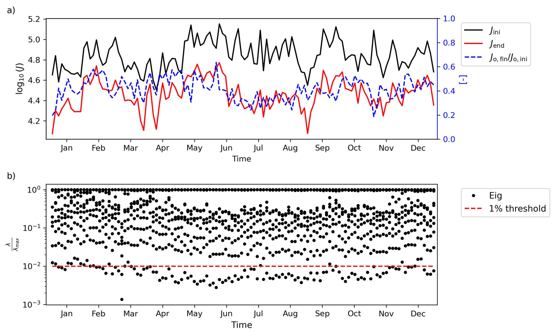 Figure 2(a) Time evolution of the initial cost function (black line), its value after data assimilation (red line), and the ratio of the final to the initial value of the part of the cost function related to observations (blue dashed line). (b) Ratio of eigenvalues to the maximum eigenvalue associated with the matrix Tm (black dots) and 0.01 threshold (red dashed line), for each assimilation window.