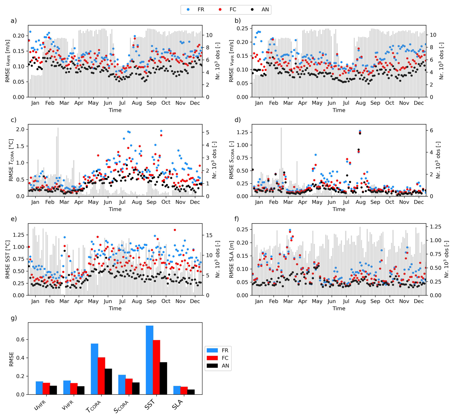 Figure 3Time series of the RMSE between modeled and observed values for the free run (FR) in blue, forecast (FC) in red and analysis (AN) in black. Grey bars represent the amount of assimilated observations during each assimilation window. (a) and (b) u- and v-velocity components from HFR, respectively; (c) and (d) in situ temperature and salinity from the CORA dataset, respectively; (e) SST, (f) SLA. In (g) the average RMSE weighted on the number of observation per assimilation window for the variables analyzed is reported.