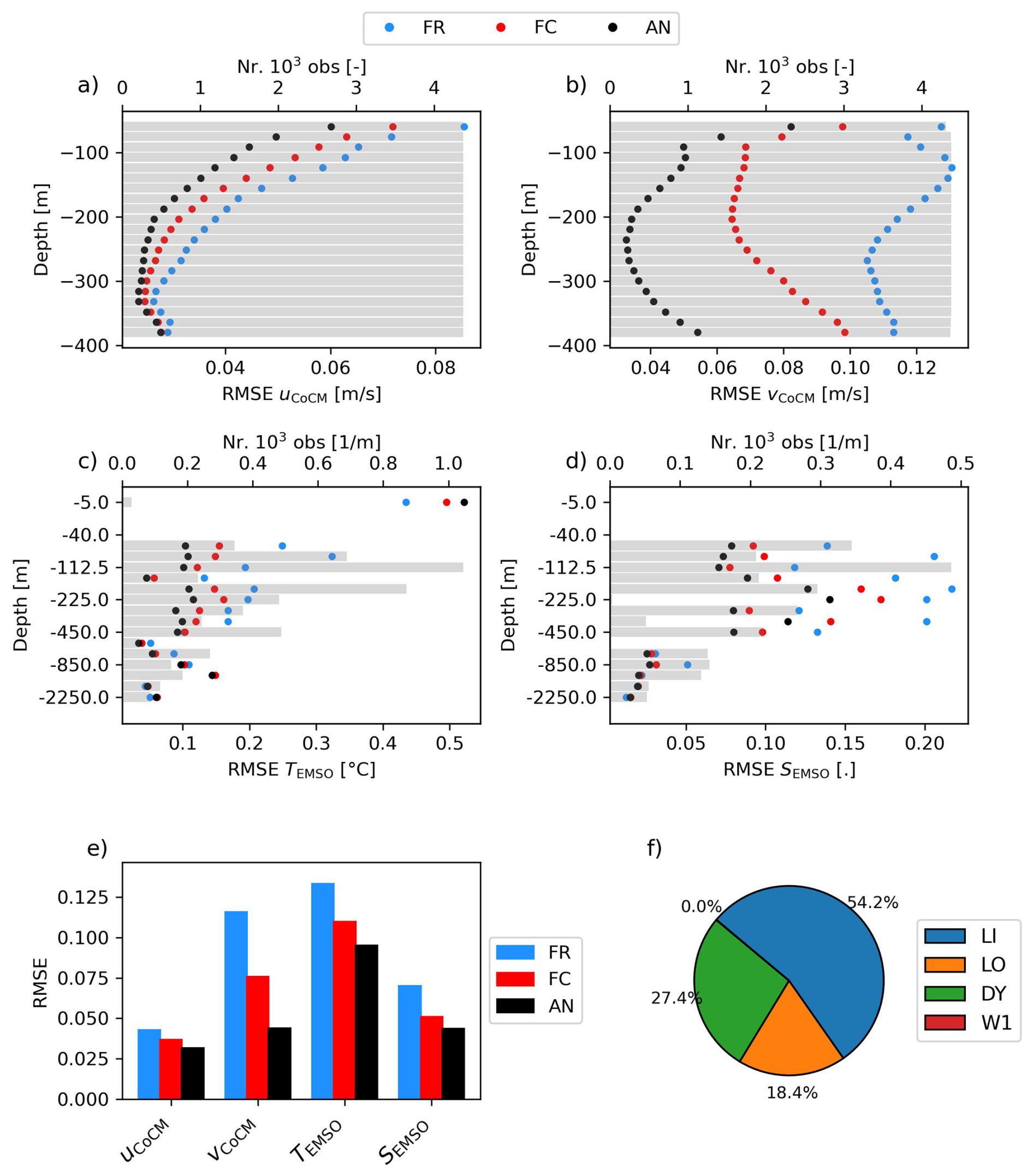Figure 4Distribution with depth of the RMSE between modeled and observed values for the free run (FR) in blue, forecast (FC) in red and analysis (AN) in black. Gray bars represent the number of assimilated observations at each depth; (a) and (b) u- and v-velocity components from the CoCM, respectively; (c) and (d) in situ temperature and salinity from the EMSO dataset, respectively. (e) Average RMSE weighted on the number of observation per assimilation window for the variables analyzed is reported. (f) Quantitative distribution of observations per platform (Fig. 1).