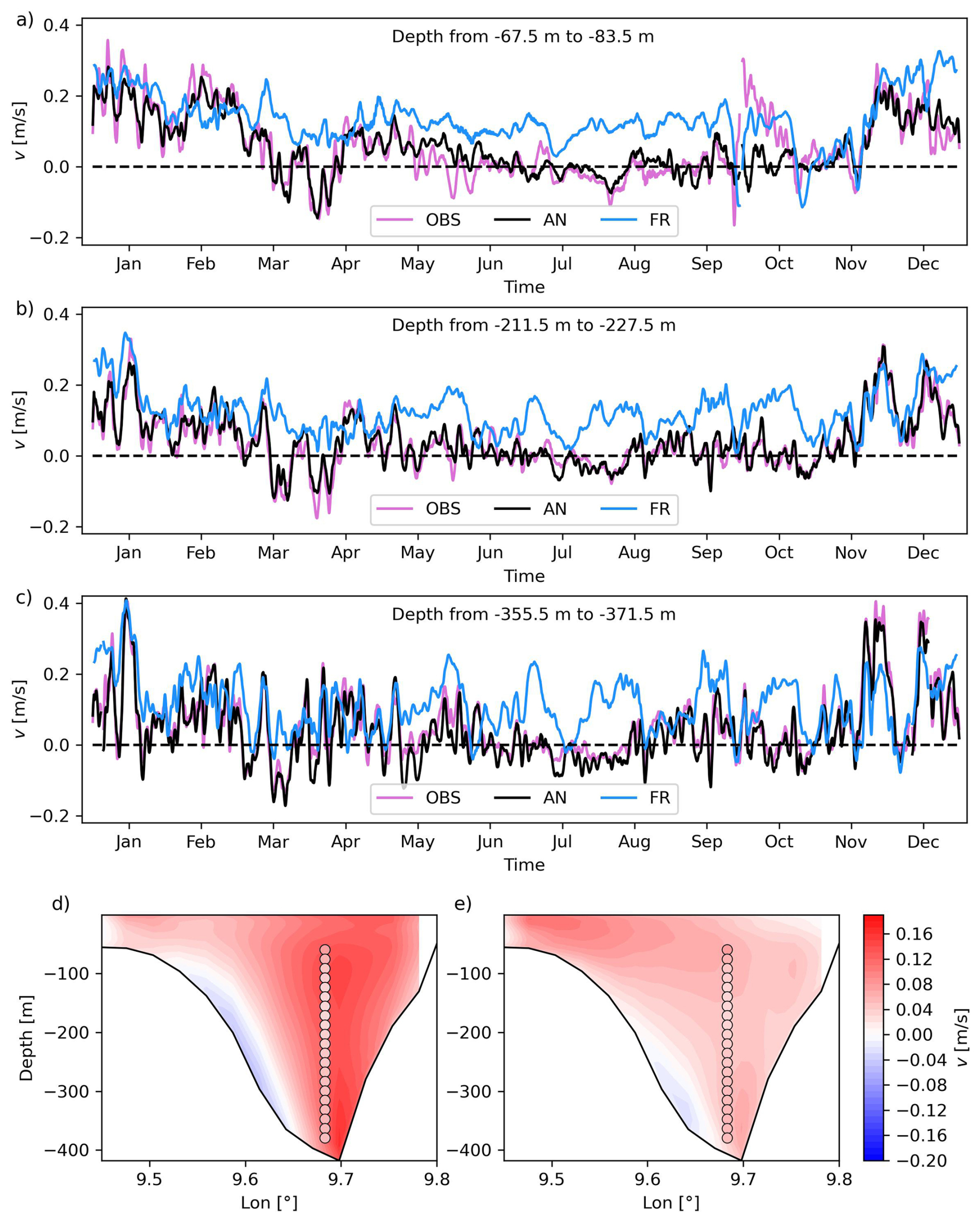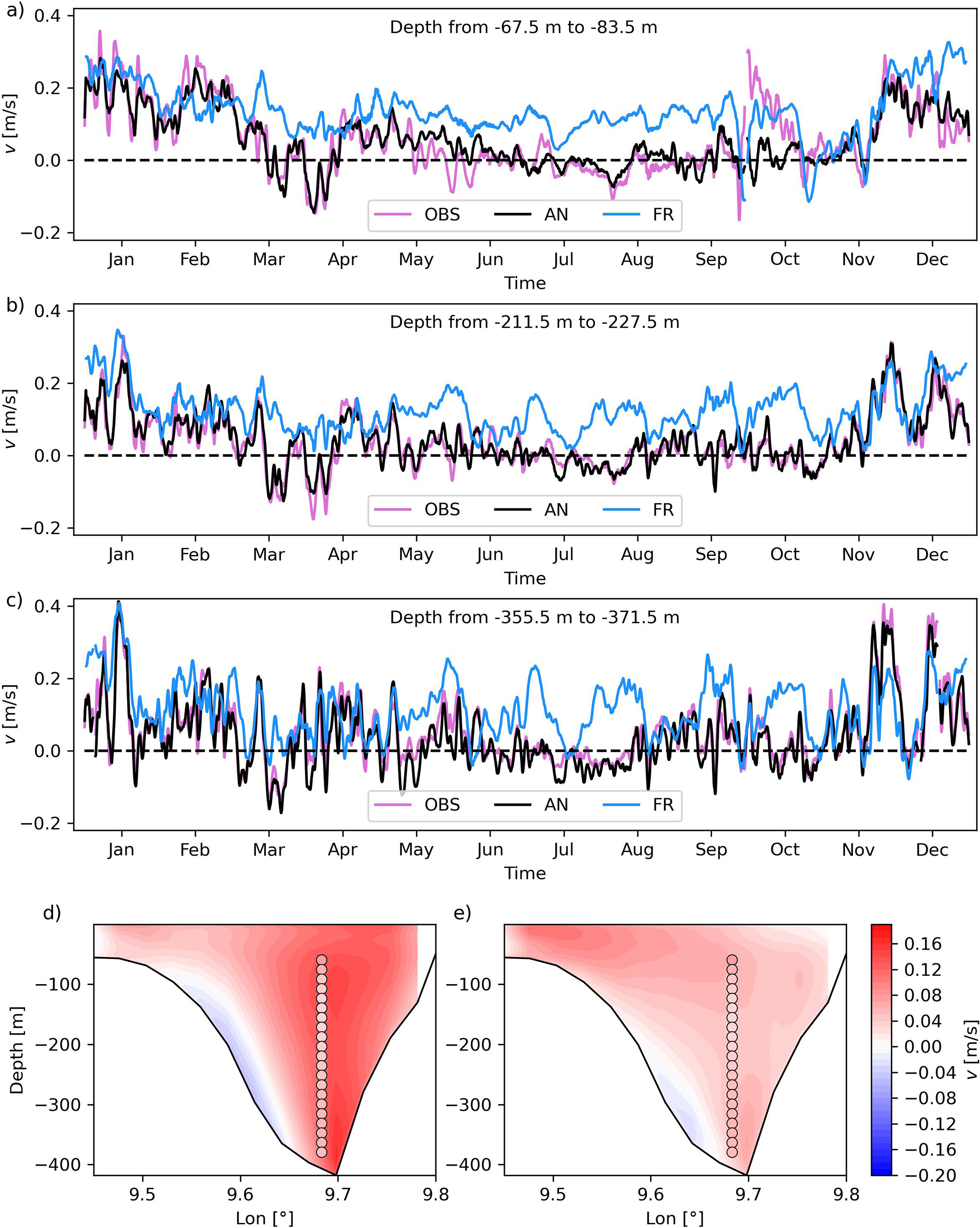 Figure 5Time evolution of the observed (violet), and modeled by FR (light blue) and AN (black) runs of the v-component of the velocity at the CoCM at different depth intervals: (a) from 67.5 to 83.5 m; (b) from 211.5 to 227.5 m; (c) from 355.5 to 371.5 m). Yearly averaged value of the v-component of the velocity at the transect in correspondence of the CC mooring for FR (d) and AN (e), together with yearly averaged observed values (colored dots).