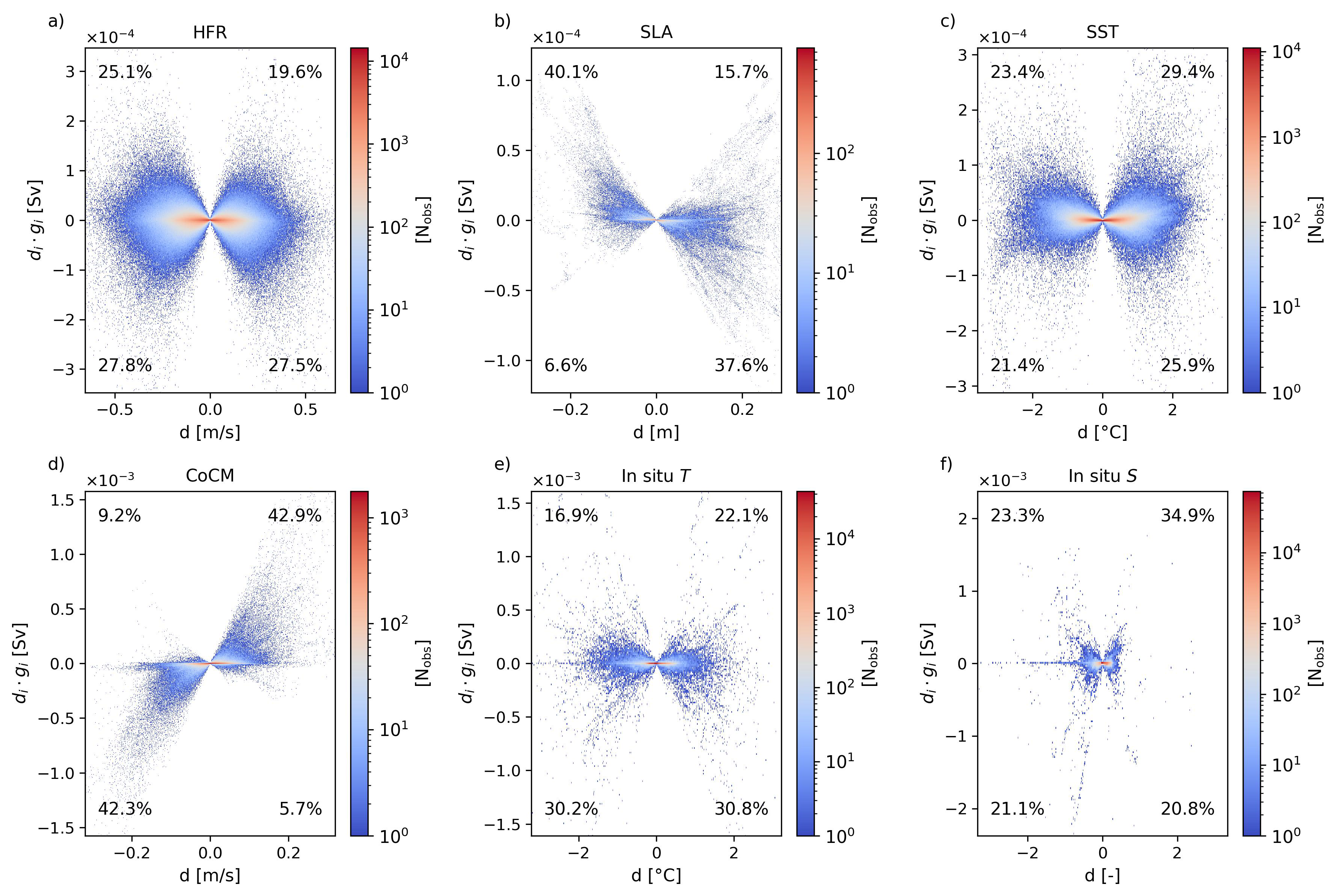 Figure 7Density scatter plot of innovation d vs. single increments digi for different typology of observations: (a) high-frequency radars, (b) sea surface height, (c) sea surface temperature, (d) Corsica Channel mooring, (e) in situ temperature, (f) in situ salinity.