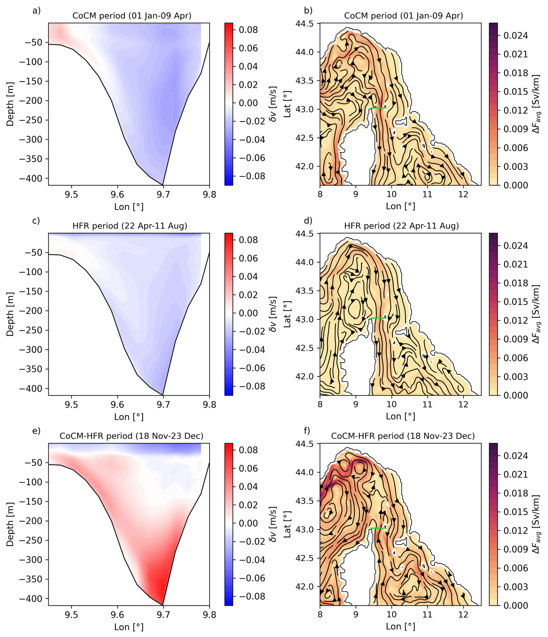 Figure 8Time averaged values of the northward velocity increment δv at the Corsica Channel for specific time intervals chosen with regards to Fig. 6c: (a) from 1 January to 9 April; (c) from 22 April to 11 August; (e) from 18 November to 23 December. Time averaged values of the increment in transport magnitude per unit width ΔFavg for specific time intervals: (b) from 1 January to 9 April; (d) from 22 April to 11 August; (f) from 18 November to 23 December. Streamlines are created on the basis of the vector field (ΔFu,avg, ΔFv,avg). The green line in panels (b), (d), and (f) indicates the transect.