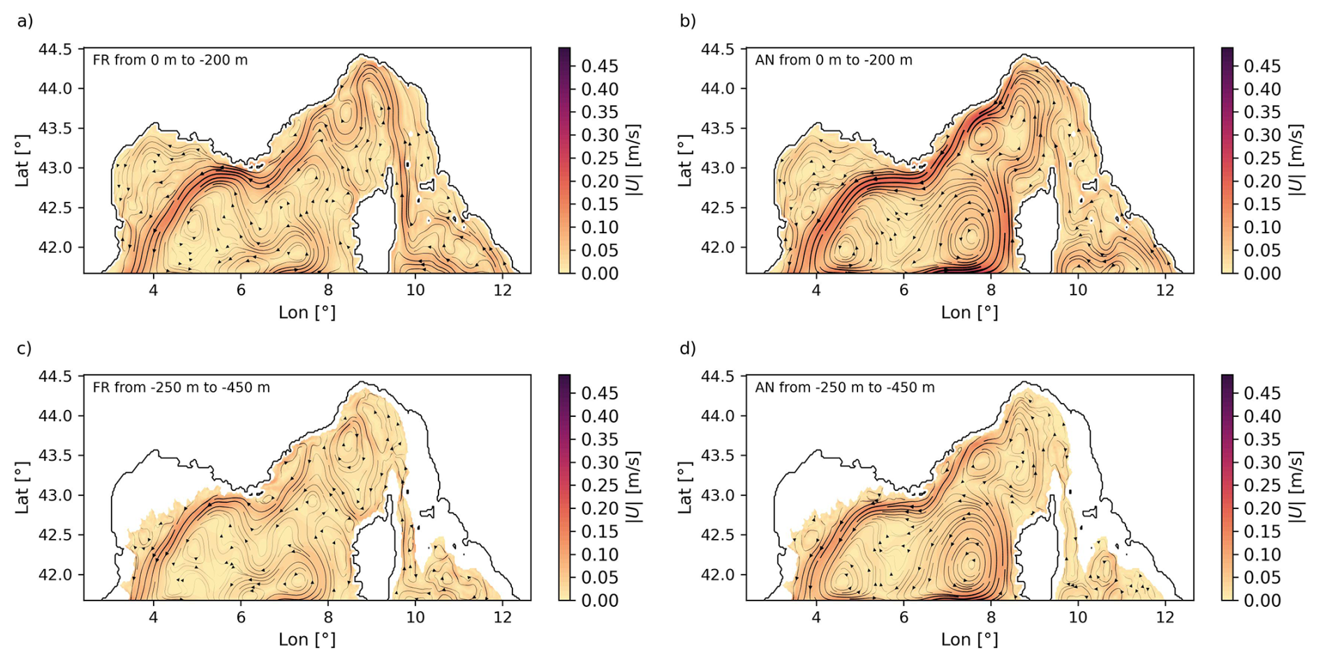 Recalling that the yearly averaged transport values that we obtained at the CC for FR, FC and AN are equal to 0.49, 0.31, and 0.28 Sv, respectively, these values are lower than previous estimates based on observations, ranging from 0.54 to 0.71 Sv (Astraldi and Gasparini1992; Astraldi et al.1994), and numerical models, such as 0.49 Sv in Sciascia et al. (2019) and 0.5 Sv in Béranger et al. (2005), the latter based on a multi-decadal time series. However, reanalysis by de La Vara et al. (2019) and Barral et al. (2024) obtained an average transport around 0.33–0.34 and 0.35±0.365Sv, respectively, considering the whole transect including the CC and the area from the Island of Capraia to the Italian coast.
