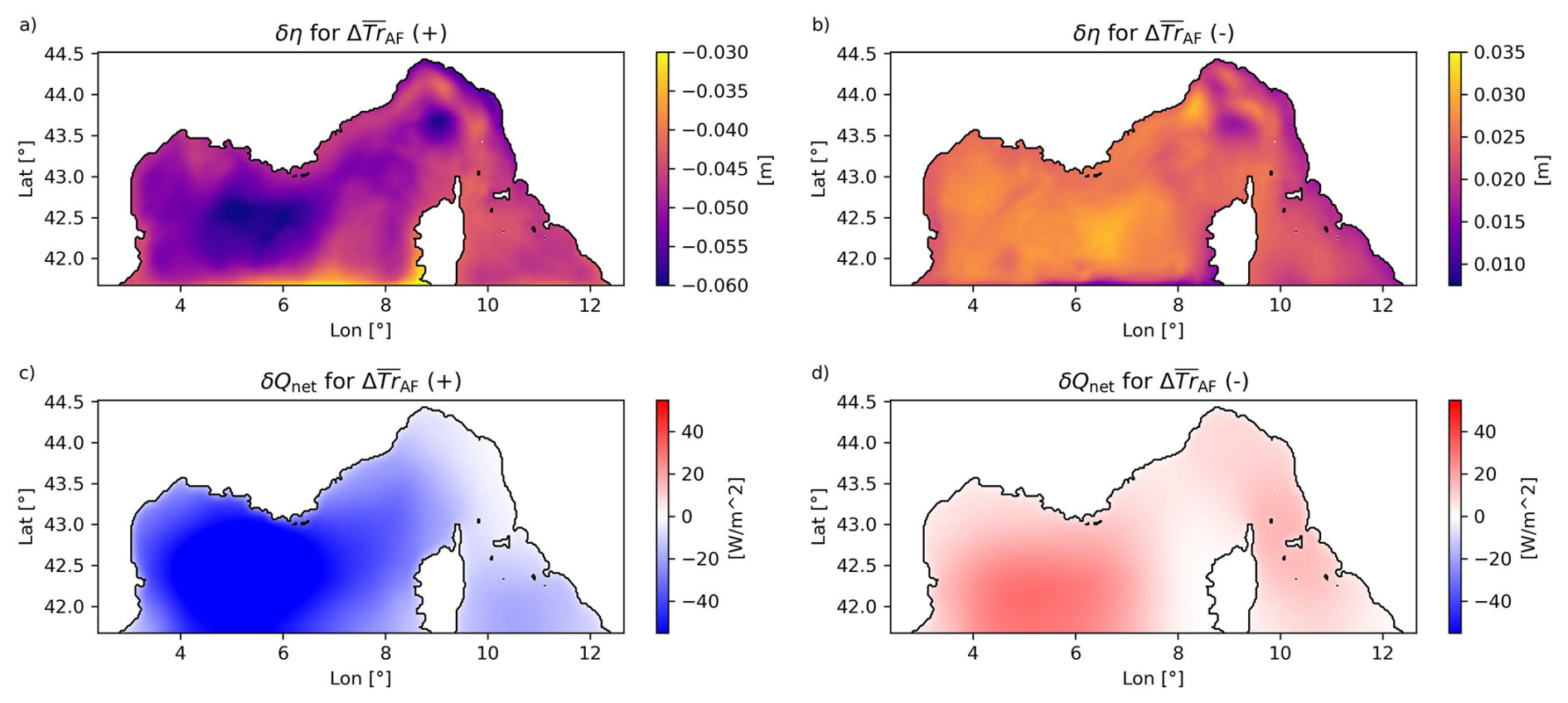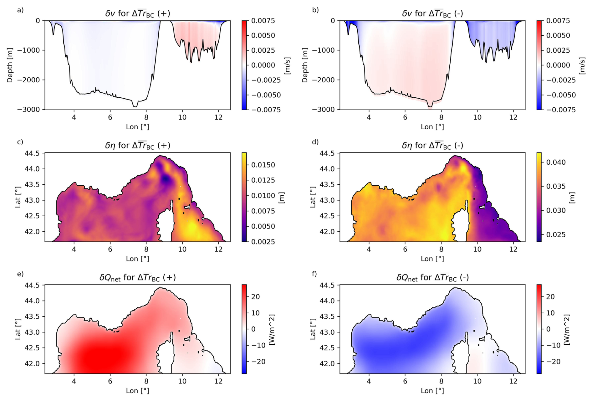 Another key period is from 18 November to 23 December, when CoCM-driven positive increments are counterbalanced by HFR-driven reductions (Fig. 6c). The corresponding average increment in velocity at the Corsica Channel cross section δv and the spatial distribution of ΔF(x,y)avg for the eastern part of the modeled domain are reported in Fig. 8e and f, respectively. Figure 8e reveals surface deceleration from HFR and subsurface acceleration from CoCM, with an additional northward acceleration provided by SST (Fig. 6c), which is reasonably concentrated mainly at the surface. The corresponding average transport increment shows an east-west contrast, with acceleration near Corsica and deceleration across the Tuscany Archipelago (Fig. 8f). This acceleration at the eastern flank of Corsica, and deceleration at the Tuscany coast, are present at the southern boundary, where an anticyclonic structure in the average transport increment is formed. We argue it is a modulation of the Bonifacio Gyre whose cyclonic structure, if weakened, tends to favor the transport in the CC for this particular current pattern. This happens in correspondence of a period (18 November–23 December) where both IC and AF (other than BC) play a role in constraining the transport in the CC (Fig. 6d) and it is indeed the atmospheric forcing that acts to modulate the intensity of the Bonifacio Gyre (Astraldi and Gasparini1994; Iacono and Napolitano2020).