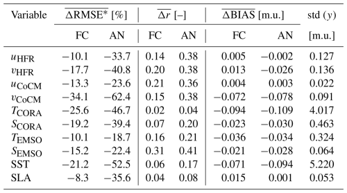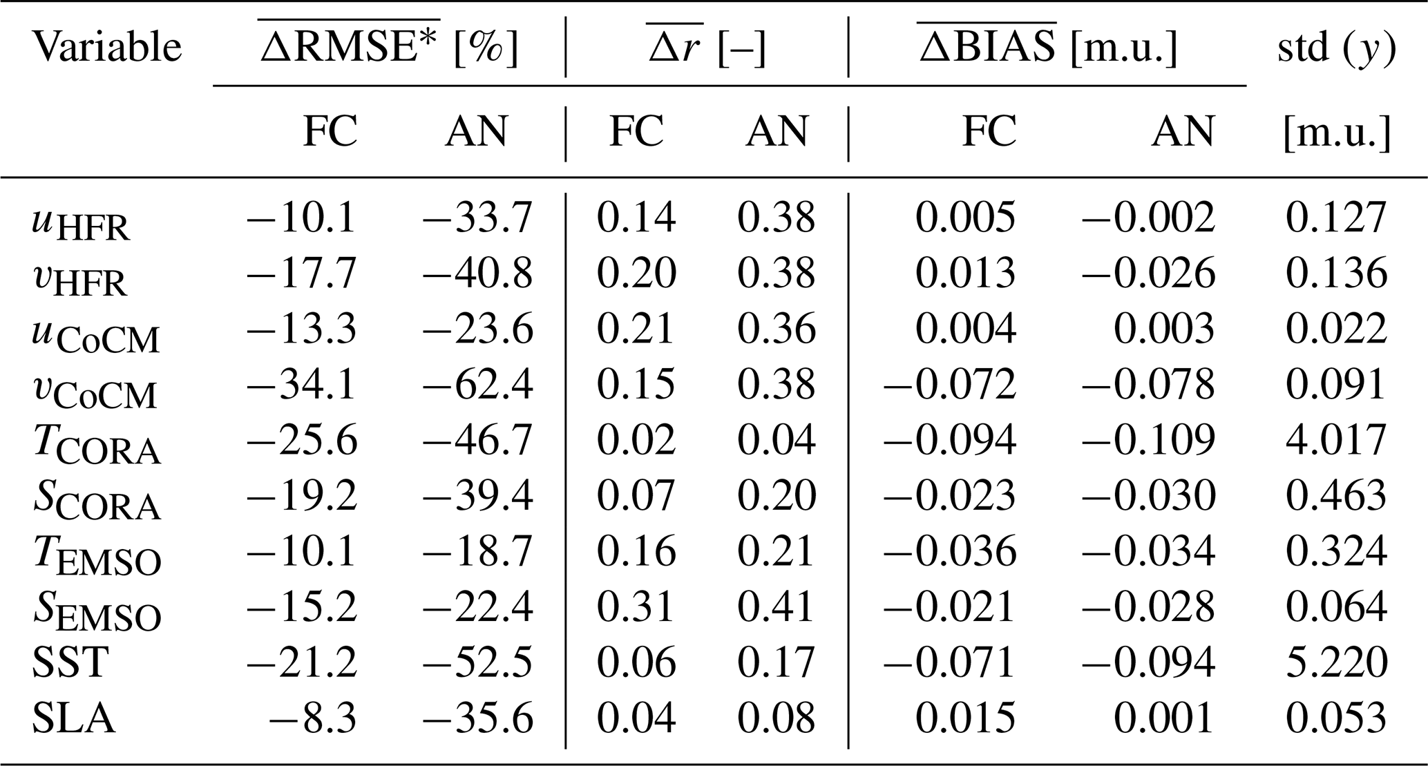 Table 1Columns 2 and 3 show the average relative difference of RMSE between the forecast and freerun (FC), and the analysis and freerun (AN), weighted on the number of observation for each assimilation window for each observation type in column 1; negative values indicate improvement and vice-versa. Columns 4 and 5 show the average increase/decrease in Pearson's r correlation between forecast and freerun (FC), and analysis and freerun (AN), weighted on the number of observation for each assimilation window; positive values indicate improvement and vice-versa. Columns 6 and 7 show the difference in the mean total bias (in absolute value) between forecast and freerun (FC), and analysis and freerun (AN). For the ΔBIAS each value have the measurement unit of the associated variable; negative values indicates improvement and vice-versa. Last column contains the standard deviation of observations.