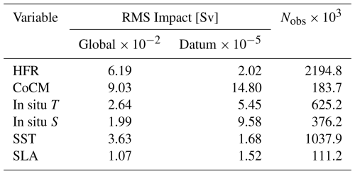 In situ velocity observations from the CoCM are the most influential in constraining the CC transport, especially when considering the average impact per observation. Aggregated over time, HFR data emerge as the second most effective data source. However, each HFR observation is approximately 3–5 times less impactful than in situ T and S measurements, and about 7 times less impactful than CoCM data. This can be explained by the fact that in situ data directly affect the whole water column, whereas surface data can only influence it indirectly, through the adjoint. While SST observations have greater overall impact than SLA on aggregate, the impact of individual observations of each of the two types is similar (Table 2) in agreement with the different amount of observations Nobs.