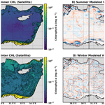 In search of possible explanations for the winter-time difference between the two regions, daily images of satellite ocean color data are examined and compared to the modeled surface vorticity. The spatial characteristics of Chl display patterns that are qualitatively consistent with the modeled surface vorticity field (Fig. 2). Focusing on the area downstream of the Nile Delta, during summer (Fig. 2A, B), both fields display a distinct separation between the coastal region and the open sea, consistently generating a series of mesoscale (horizontal scales of about 10–100 km that last for days to weeks) meanders with relatively high Chl concentrations and high levels of vorticity that are constrained to the near-shore area. In contrast, during winter, the distinction between the coastal and open sea regions is substantially less pronounced and we observe small-scale variability in Chl concentrations and modeled vorticity throughout the entire EMS (Fig. 2C, D). However, while the Chl concentrations decay with increasing distance from the coast (Figs. 5, A1), the surface vorticity field is almost uniform throughout the basin. The similarities between the organization of the chl concentration and vorticity structures in the model solution further emphasize that the model captures the important seasonal circulation features in the region.