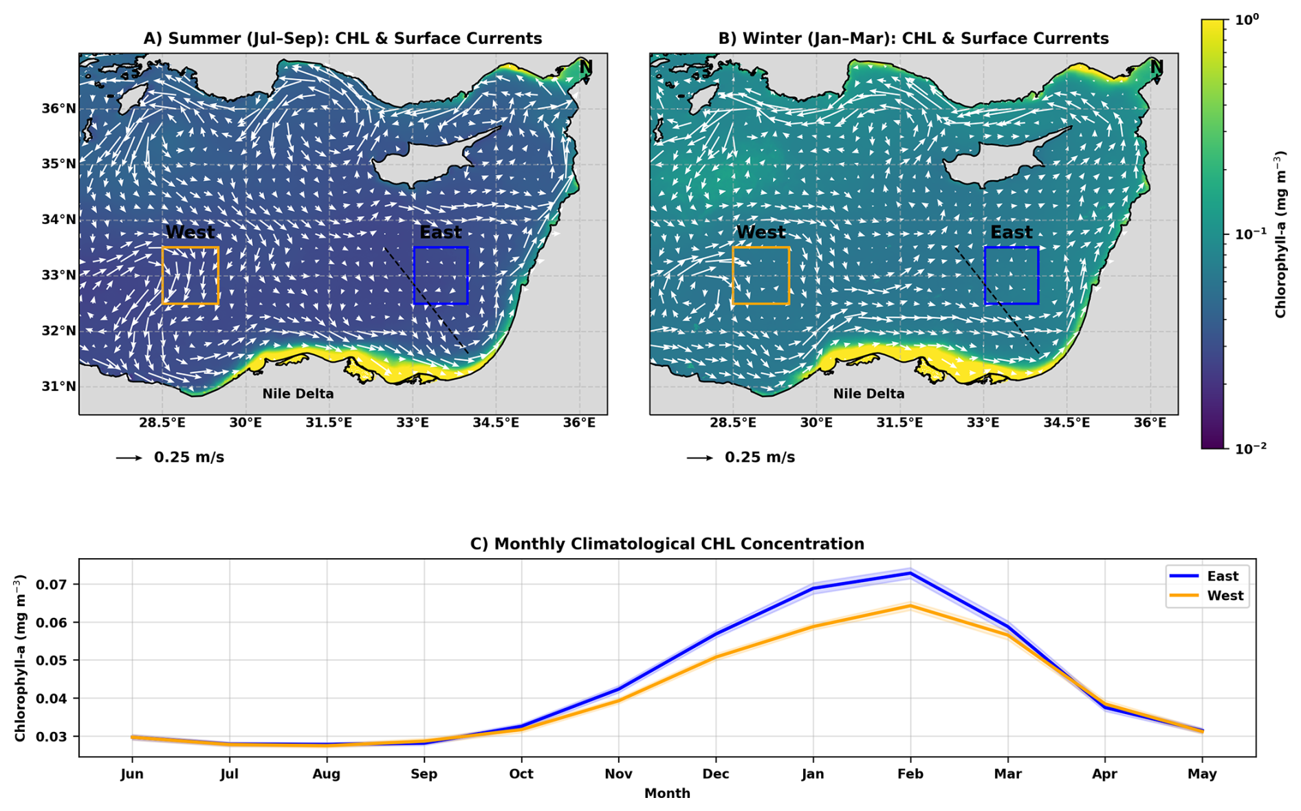 Figure 1(A) Long-term summer (July–September) mean satellite-derived surface Chl (mg m−3) over the EMS, with geostrophic surface currents overlaid in white. Blue and orange boxes denote the eastern (32.5–33.5° N, 33–34° E) and western (32.5–33.5° N, 28.5–29.5° E) pelagic regions used for statistical comparisons. The black dashed line marks the coast-to-open-sea transect used to compute the chlorophyll enrichment factor. (B) Long-term winter (January–March) mean Chl and modeled surface currents for the same region. (C) Monthly climatology of Chl in the eastern (blue) and western (orange) regions; shaded areas denote 95 % confidence intervals. Satellite data and modeled currents span 2010–2019.