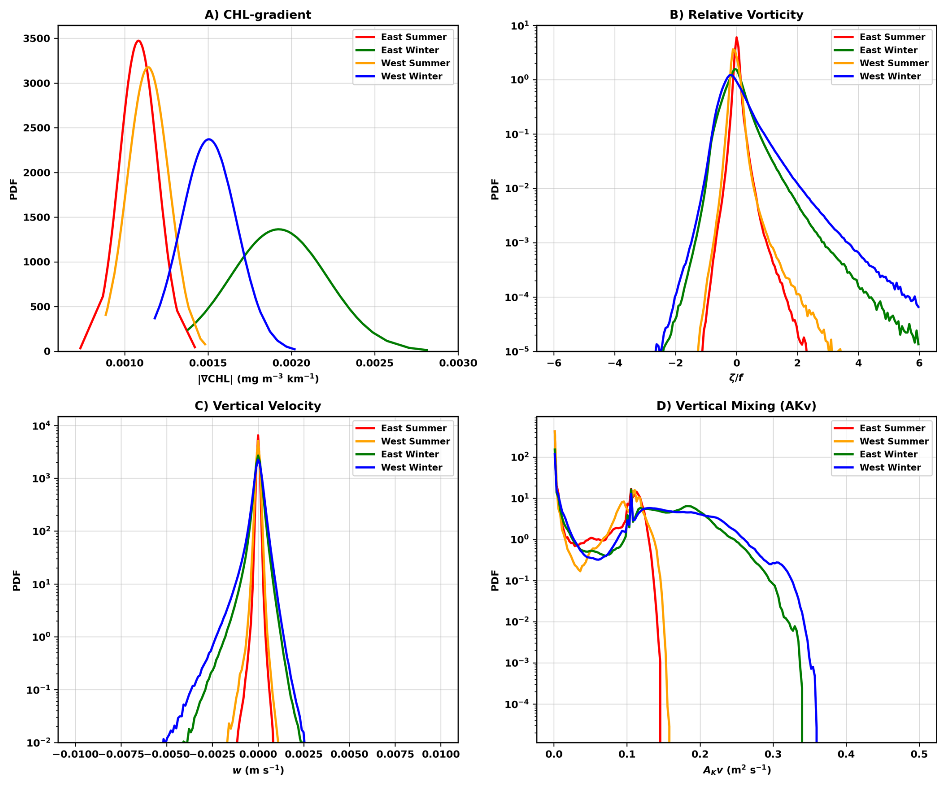 To examine the dynamical forcing associated with submesoscale activity, we additionally computed PDFs of near-surface relative vorticity () from the 1 km numerical simulation, using the seasonally averaged values provided in the model output. Vertical velocity (w) at 20 m depth and the parameterized vertical mixing coefficient AKv (from the K-Profile Parameterization scheme; Large et al., 1994) were extracted along the same regional boxes, seasonally averaged, and converted to PDFs using the same normalization procedure.
