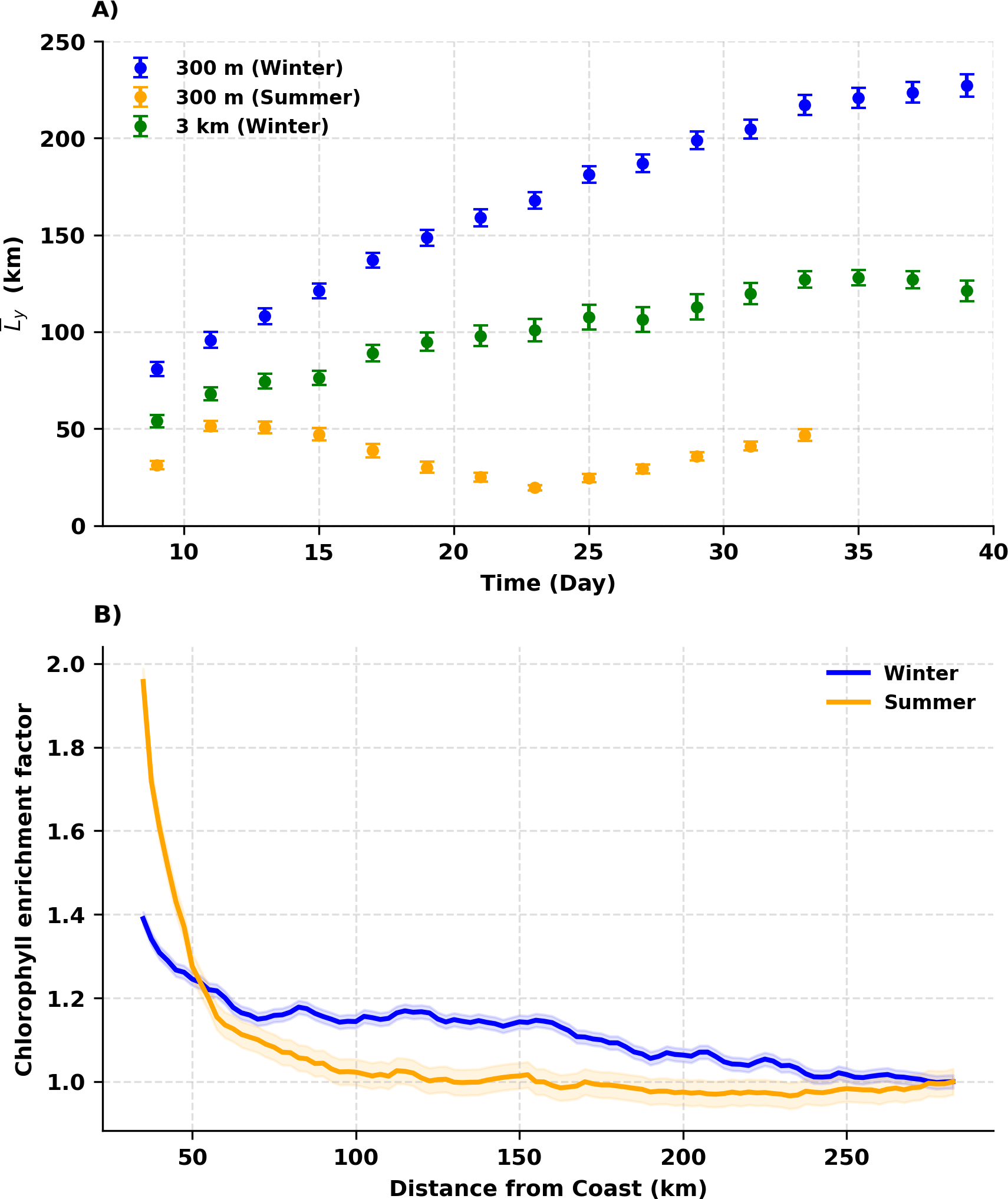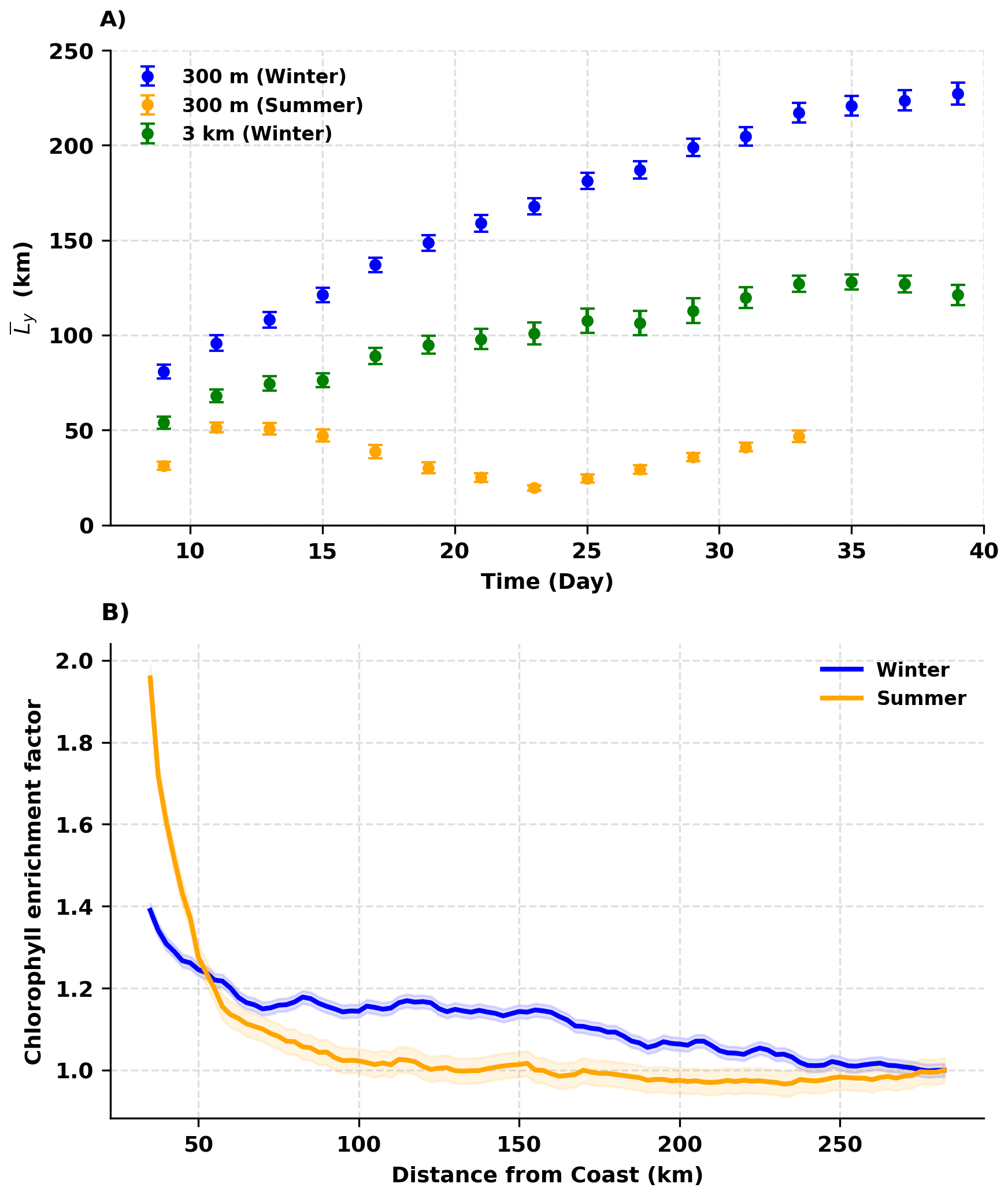 Figure 5(A) Mean offshore distance of particles in the summer 300 m, winter 300 m, and winter 3 km simulations. Offshore distance is computed over latitudes 32.2–34.5° N using the envelope definition described in Fig. A4. (B) Chl enrichment factor (CEF) along the transect shown in Fig. 1A, B for winter and summer. Shaded regions denote 95 % confidence intervals. CEF is computed from 10 years of satellite-derived Chl (2010–2019).