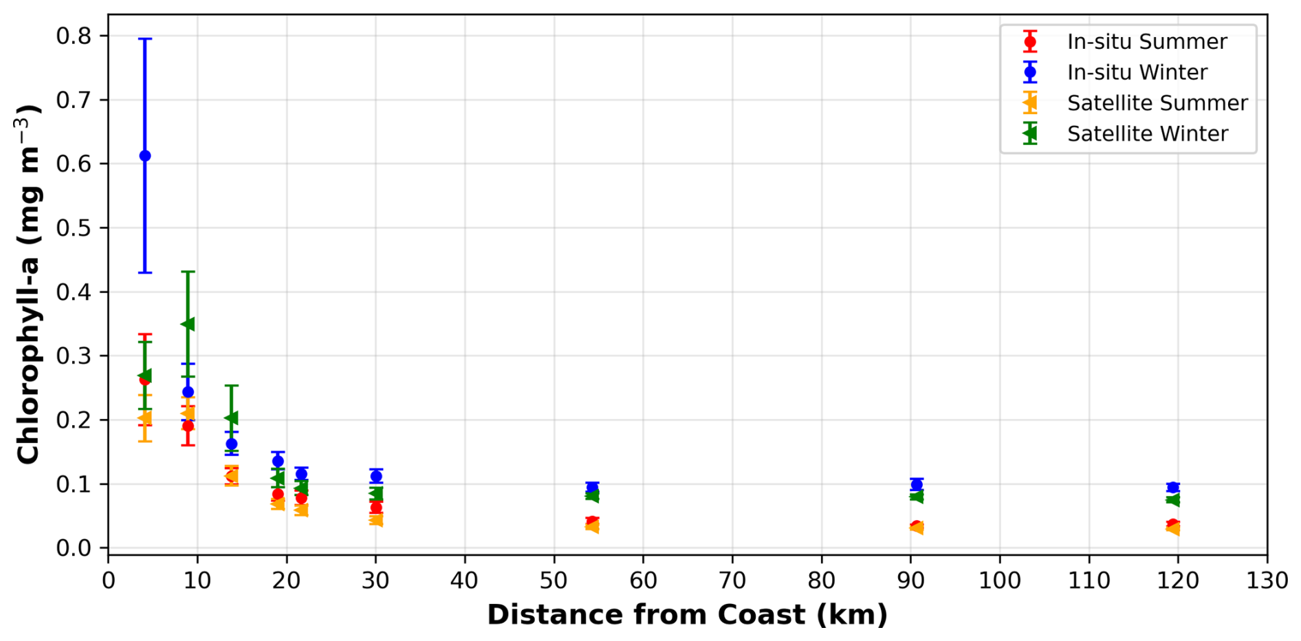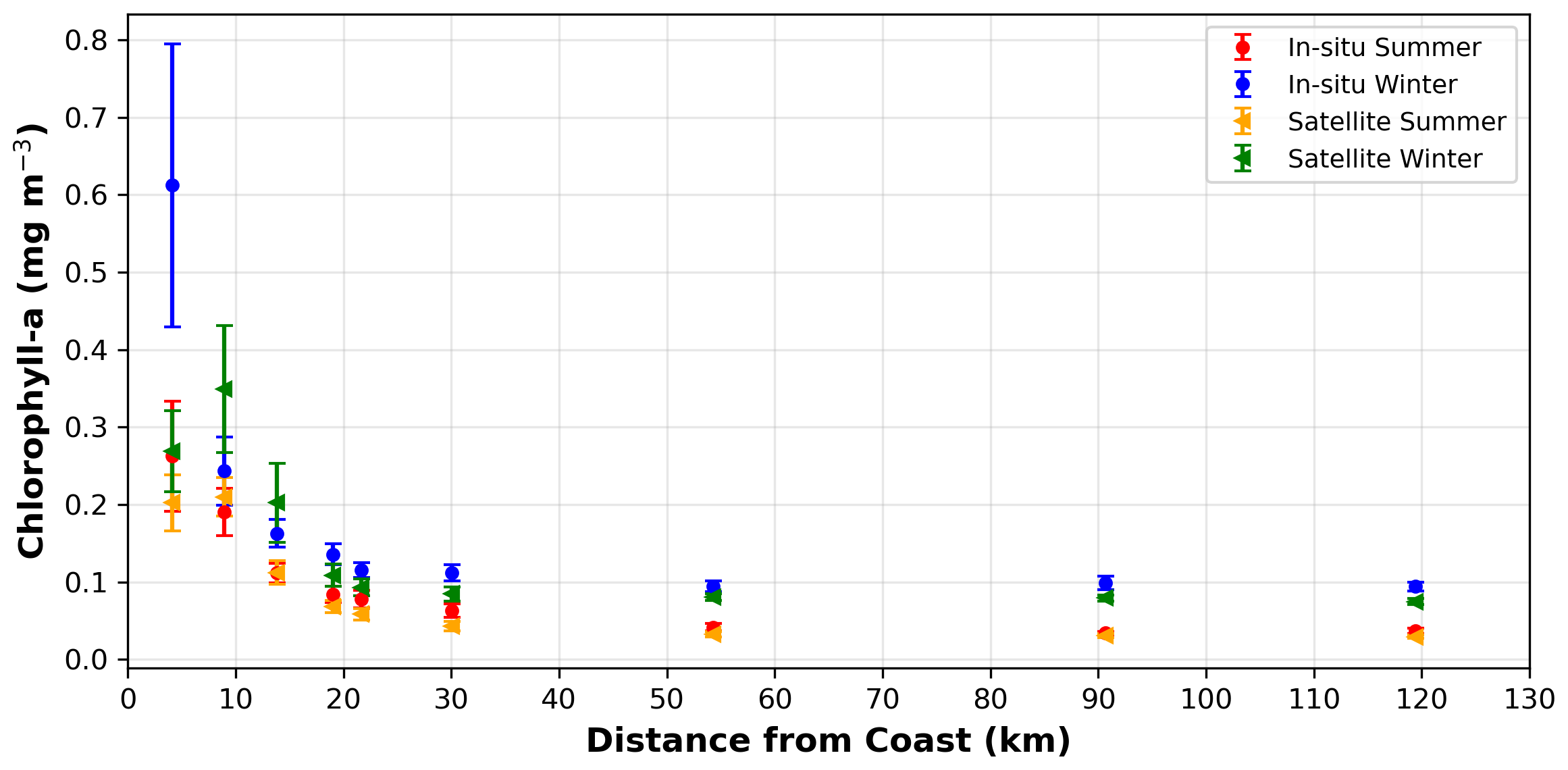 Figure A1Comparison of Chl (mg m−3) concentrations measured during the Haifa Section Cruises (averaged 2002–2020) and satellite data from Copernicus (averaged 2010–2019) at 9 stations with increasing distances from the coast. Both in-situ and satellite measurements show the same general trend with higher concentrations by the coast that gradually drop with distance from the coast. The decrease rate during the winter slows down at approximately 55 km from the coast and levels out while during the summer the CHL values continue to decline. The error bars demonstrate how there is substantially more variability in the coastal measurements compared to the open sea.