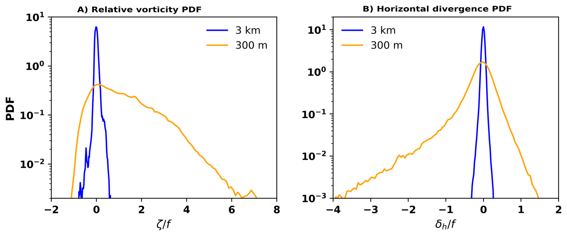 Figure A2PDFs of vorticity and horizontal velocity divergence associated with the offshore particles, defined as those that are more than 100 km away from the coast. The offshore particles are sampled from day 19–day 40. The vorticity (horizontal divergence) PDF from 300 m simulation clearly shows positive (negative) skewness, suggesting that the offshore particles are associated with the submesoscale convergent cyclonic filaments. These features are also observed from the 3 km solution, as the vorticity PDF is positively skewed (skewness = 0.55) and the horizontal divergence negatively (skewness = −0.22). Nevertheless, the skewness magnitudes in the 3 km simulation is significantly smaller than the 300 m solution.