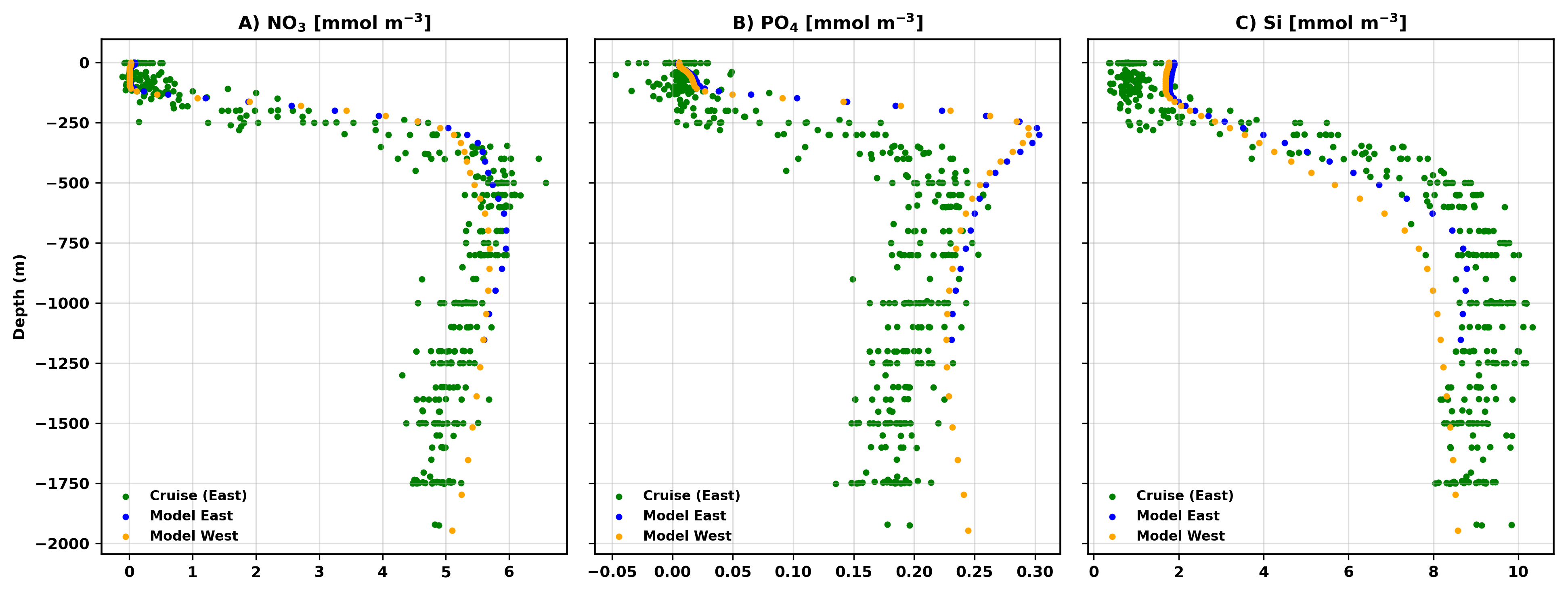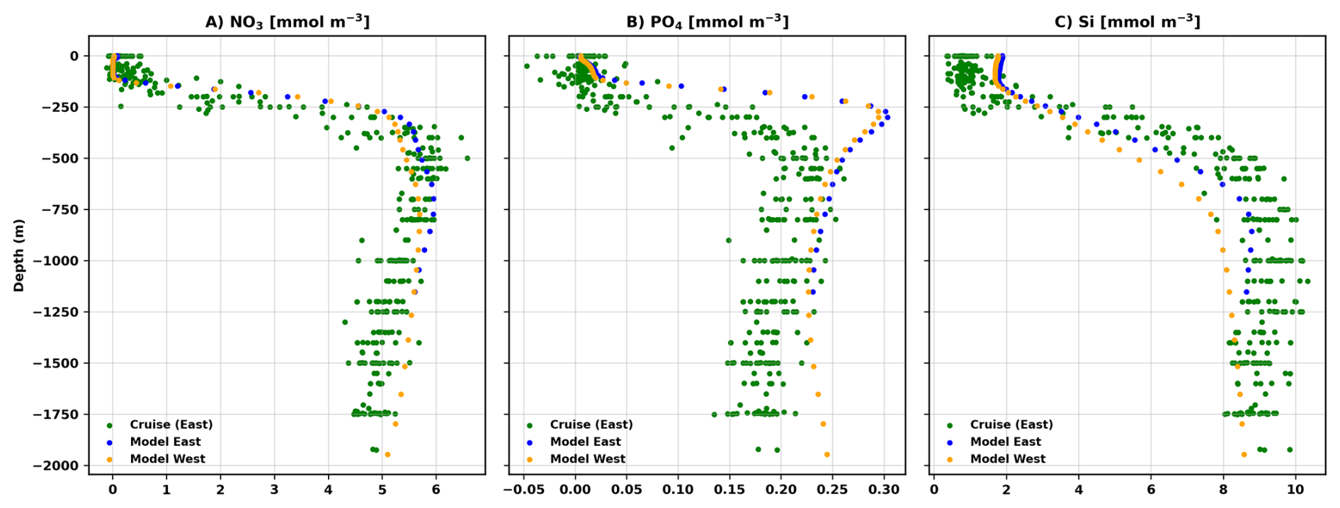 Figure A3(A–C) Comparisons of nutriclines (NO3, PO4, Si) between the PISCES biogeochemical model averaged over the two study regions (2002–2019) and Haifa Section cruise data collected between 2002–2019 within the eastern region. The modeled nutrient profiles reproduced the observed nutricline structure with high fidelity (NO3: r=0.96; PO4: r=0.79; Si: r=0.97), indicating that the vertical shape and depth of nutrient gradients are realistically represented. However, Kolmogorov–Smirnov tests (p≪0.001) reveal systematic offsets in concentrations, with the model tending to overestimate NO3 and PO4 and slightly underestimate Si. Comparison between the eastern and western model domains shows that the profiles are nearly identical in shape (r≥0.998), with only small magnitude differences for NO3 and PO4, and a somewhat larger shift for Si. Overall, these results demonstrate that the modeled vertical nutrient structure is robust across the basin and broadly consistent with observations, with remaining discrepancies arising primarily from concentration biases rather than differences in vertical structure.