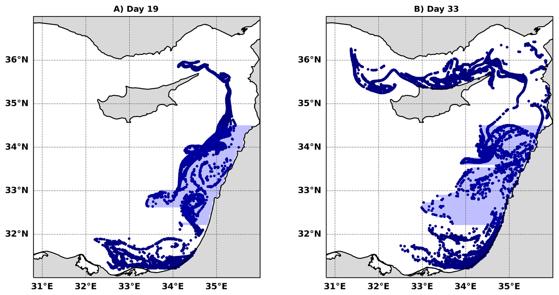 For the Lagrangian particle tracking, the particles are modeled as material points that move with the local fluid velocity. The advection of the virtual particles is carried out over a 2D horizontal plane near the surface (2 m depth) using Parcels (Delandmeter and Sebille, 2019). The software uses a bilinear spatial interpolation of the surface model velocity to the particle location, and the time-stepping is performed with an explicit RK4 scheme. The particle trajectories are computed during both winter and summer seasons, utilizing hourly velocity fields from the 300 m models. A total of 40 000 tracer particles were released arranged in a 200×200 grid pattern over a patch (31.5–32.0° N and 32.75–33.25° E) in the vicinity of the Nile Delta on 23 January 2018 and 19 July 2018 for the wintertime and the summertime analyses, respectively, and advected for 40 d during winter and 33 d during summer, until the end of the flow simulation. The particle advection during the summer is selected to coincide with a period of boundary current instabilities and spiral formation.