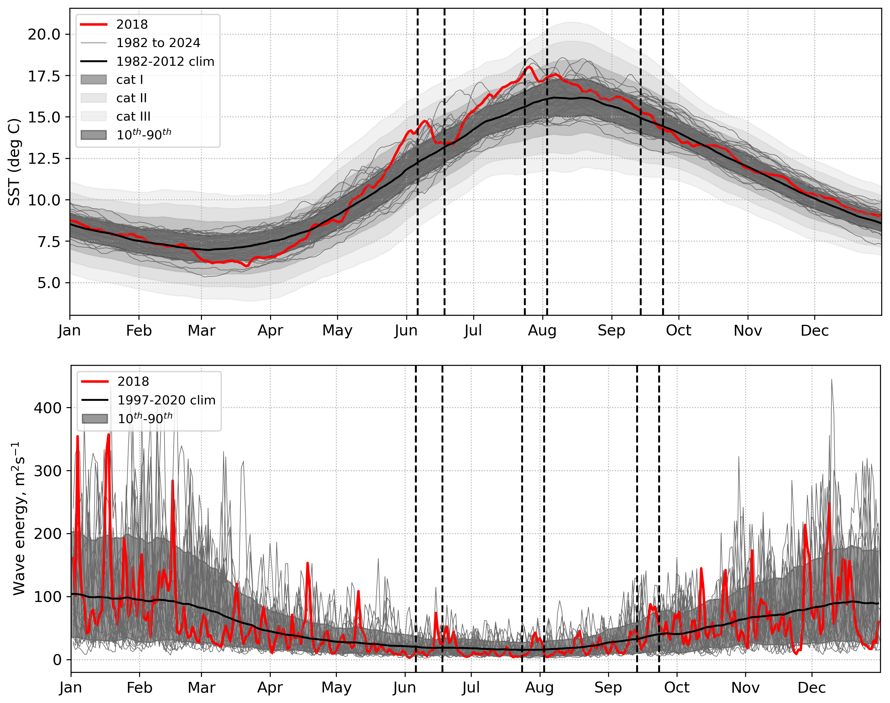 Figure 3Top – Operational Sea Surface Temperature and Ice Analysis (OSTIA) SSTs for 1982–2022, mean climatology for the time period used to define marine heatwave thresholds (1982–2012) in bold, 10th–90th percentiles (anomalies smoothed with 31 d moving average), Shading: Category I, Category II, Category III marine heatwaves using Hobday et al. (2018) averaged over the NWS. Bottom – Wave energy from Met Office wave regional reanalysis (Saulter, 2024) for 1997–2020. Yearly data shown with grey lines, mean climatology from 1997–2020 in black, 2018 in red. Grey shading between 10th–90th percentiles. Mean and percentiles smoothed with 31 d moving average. Wave energy averaged over the NWS (NWS = blue + purple regions in Fig. 1). Vertical dashed lines indicate three key 2018 storm periods.