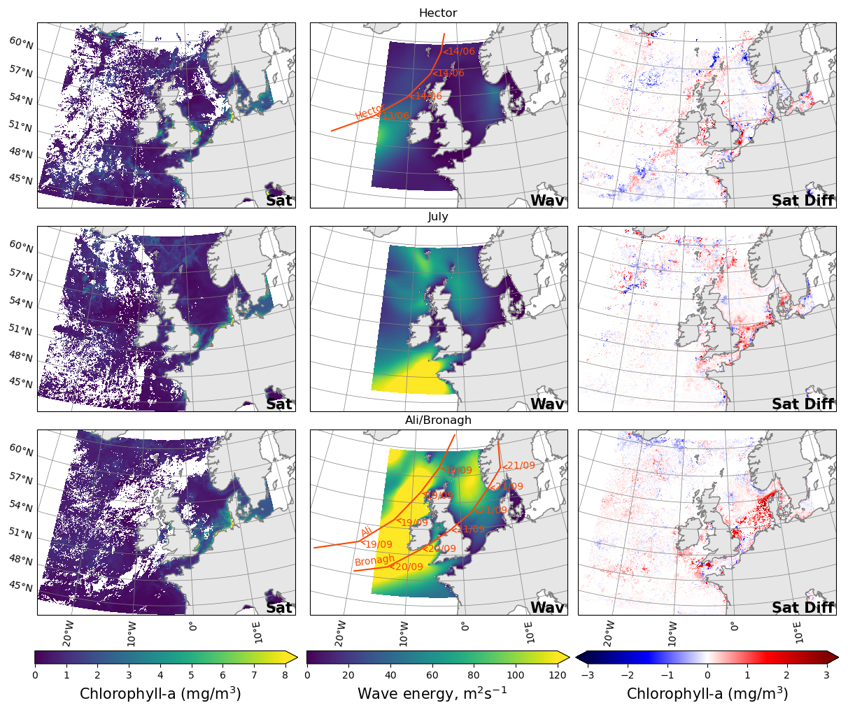 Late summer storms can either suppress or enhance chlorophyll, depending on timing and area (Fig. 4). In June, as a result of storm Hector, the concentration of chlorophyll was reduced in northern off-shelf areas, which were in bloom state, whereas chlorophyll increased on the western part of the shelf in regions which were past their bloom state. Particularly strong increases are noticeable in the Celtic Sea, Irish Sea, and Southern North Sea. Following the July storm, chlorophyll concentration was low off-shelf and the storm had a minimal impact. In contrast, the concentration increased in coastal areas of the shelf. In September, northern areas tended to see a decrease in chlorophyll from storms Ali and Bronagh, whilst southern and on-shelf areas saw a strong increase.