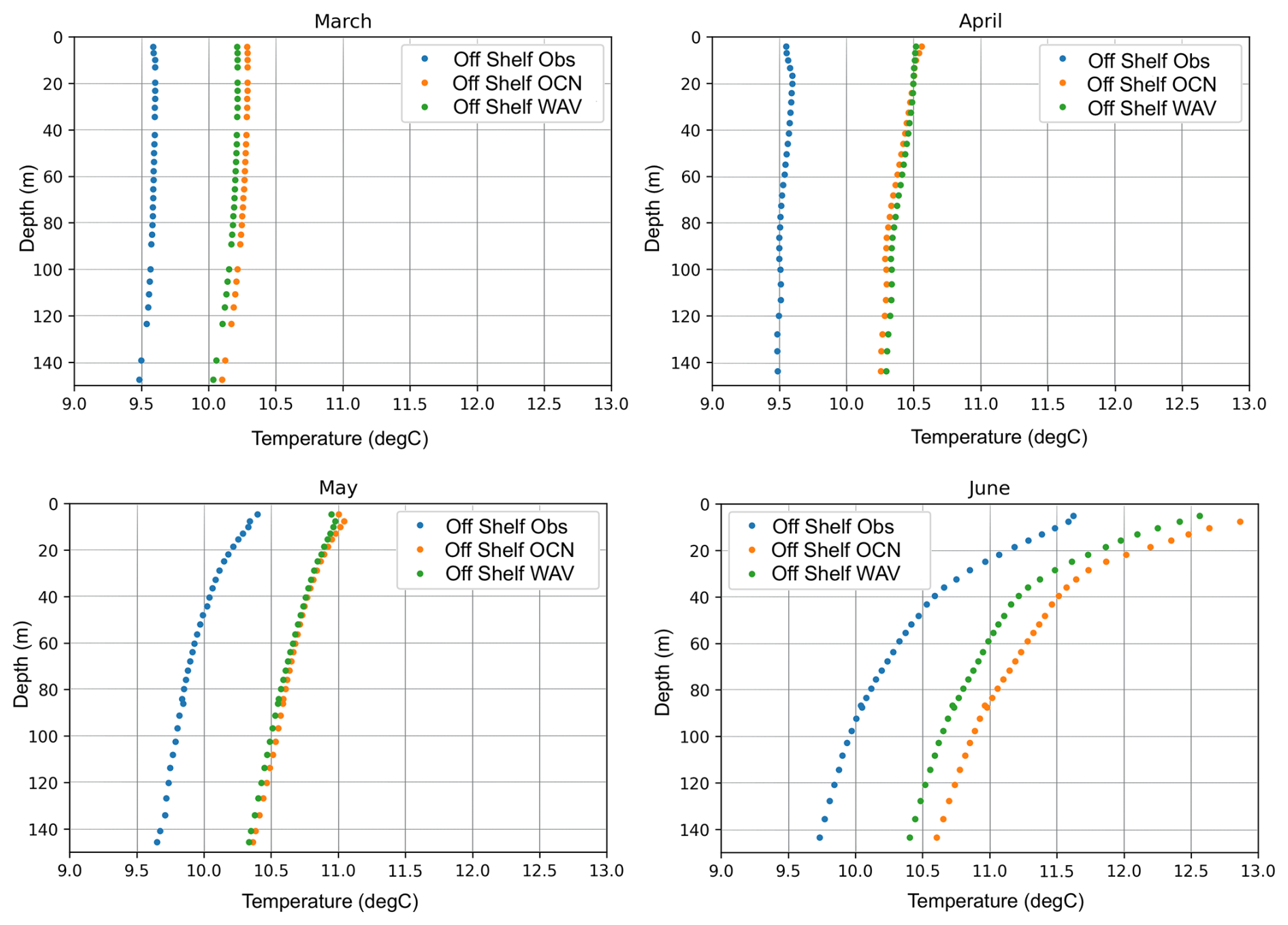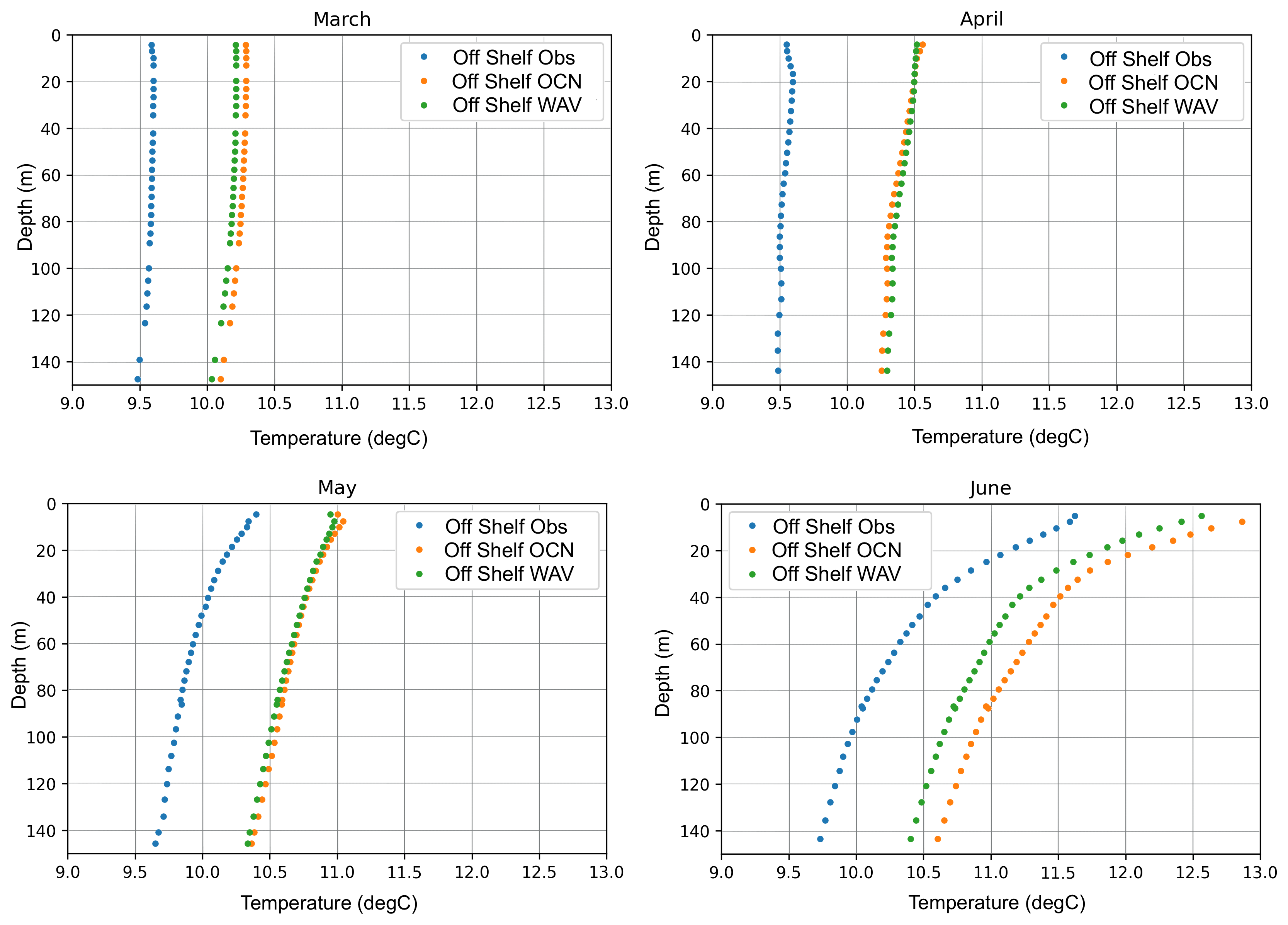 Profiles of temperature extracted from the EN4 Met Office Hadley Centre Observation Dataset (Good et al., 2013) were compared to predicted profiles of temperature from both the OCN and WAV models for March–June (Fig. 5) in off-shelf areas deeper than 200 m. Both models show a persistent warm bias off-shelf, which is due to the combination of surface forcing that itself has a warm bias and model drift before the start of our 2018 simulations. The coupling of waves results in a marginal improvement during spring when the water column is well mixed, but as it stratifies in June the impact of waves increases leading to a reduction in the overall bias.