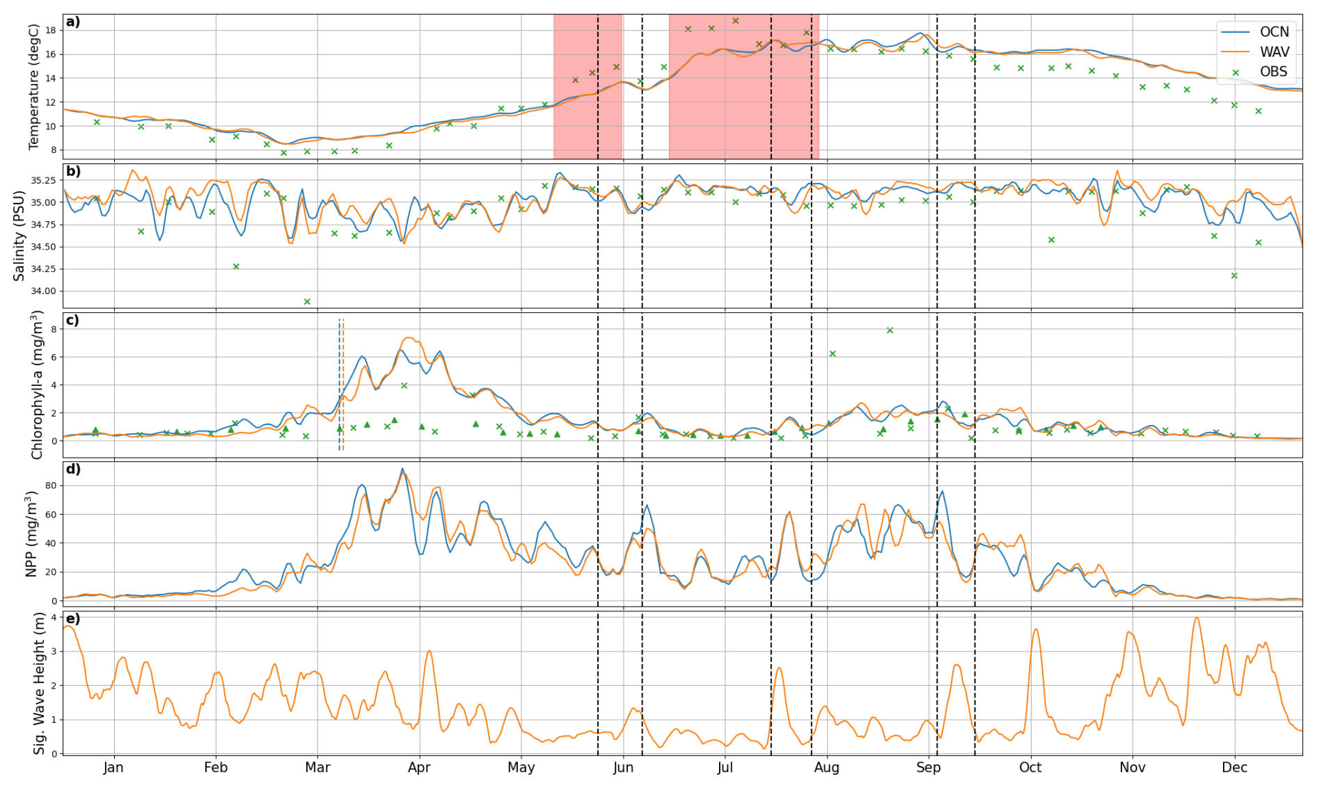 The observations confirm 2018 to be an interesting year to study the relationship between wave activity and the concentration of chlorophyll. Indeed, some years have uninterrupted summer stratification (e.g. 2017, used in Lewis et al., 2019): we choose a year in which wave activity was enhanced in spring and had intense summer wave activity events able to disrupt the ocean stratification. In the remainder of the article, we focus on how intense periods of wave activity affected the concentration of chlorophyll, and how explicitly coupling an ocean model to a wave model impacts model results.