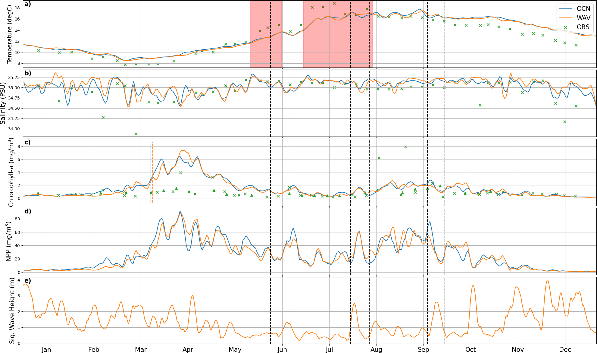 For in-situ observations of biogeochemical variables, we use data from the long-term monitoring site Station L4 (McEvoy et al., 2023), which is located on the western edge of the English channel (Fig. 1). This site contains valuable observational data, albeit in a region where wave activity does not have a significant impact. Figure 7 shows a comparison of the two simulations with observations for surface temperature, salinity and chlorophyll-a from Station L4. Also plotted are Net Primary Production (NPP) from both model runs and Significant Wave Height from the WAV simulation. Temperature is consistent between the models, with the warm bias vs. observations evident over the winter months (Fig. 7a). The effect of the marine heatwaves is clearly visible in the observations, whilst the response in the models is more muted. In winter months, the WAV model is more saline at the surface (Fig. 7b), indicating greater mixing of buoyant, freshwater inputs from the river with more saline waters. These periods typically correspond to times of higher wave activity (Fig. 7e). Low salinity events seen in the observations are missed due to the use of climatological rivers missing high rainfall events. The inclusion of waves has only a minor impact on the spring bloom at this location (Fig. 7c), with slower initial growth and a slightly delayed peak. For most of the year the models over predict the chlorophyll, consistent with the findings in Fig. 6. The models also miss the late bloom in August that appears in-situ observations, although there is no evidence in the satellite measurements of a bloom at this time.