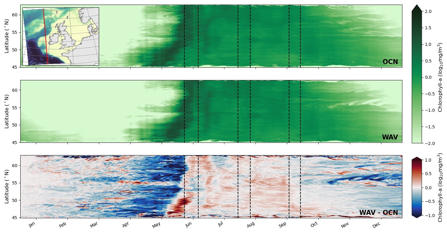 In both the OCN and WAV simulations the bloom originates in the warmer, southern part of the domain with a strong signal around April followed by a period of elevated concentrations that eventually die out in January. In the northern part of the domain the initial bloom occurs approximately two weeks later, with the elevated concentration period ending by November. The bloom is interrupted by storm Hector mid-June and a secondary bloom is clear on the on-shelf part of the transect (48–55° N) at the start of July, which corresponds to the start of the marine heatwave (Fig. 3), two weeks after storm Hector. The WAV simulations additionally show increased chlorophyll concentration in the secondary late June peak, and then in August and September near the shelf break between 48 and 55° N.