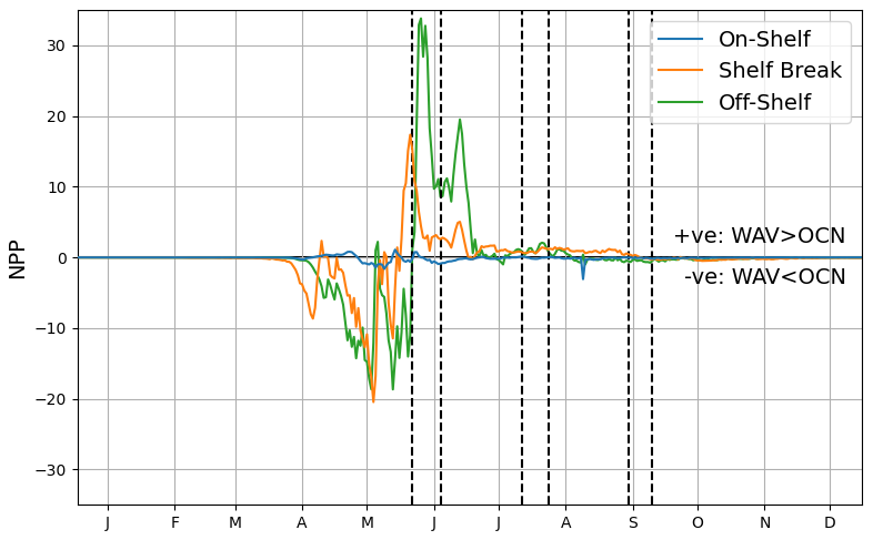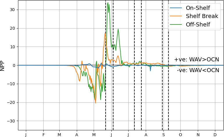 By considering the on-shelf, shelf-break and off-shelf regions, as highlighted in Fig. 1, the temporal patterns for the different zones can be assessed. Figure 9 shows the difference in mean net primary production (NPP) as a time-series. The shallow, sheltered on-shelf region is relatively less affected by the addition of waves into the system, whereas the shelf-break and off-shelf zones have a more pronounced difference. In both these regions there is a negative peak followed by a positive one, highlighting the offset nature of the blooms. In the shelf-break region, after the initial blooms for both models NPP levels are consistently higher throughout the summer when waves are included. In off-shelf areas, the offset is greater leading to a larger overall difference in primary production.